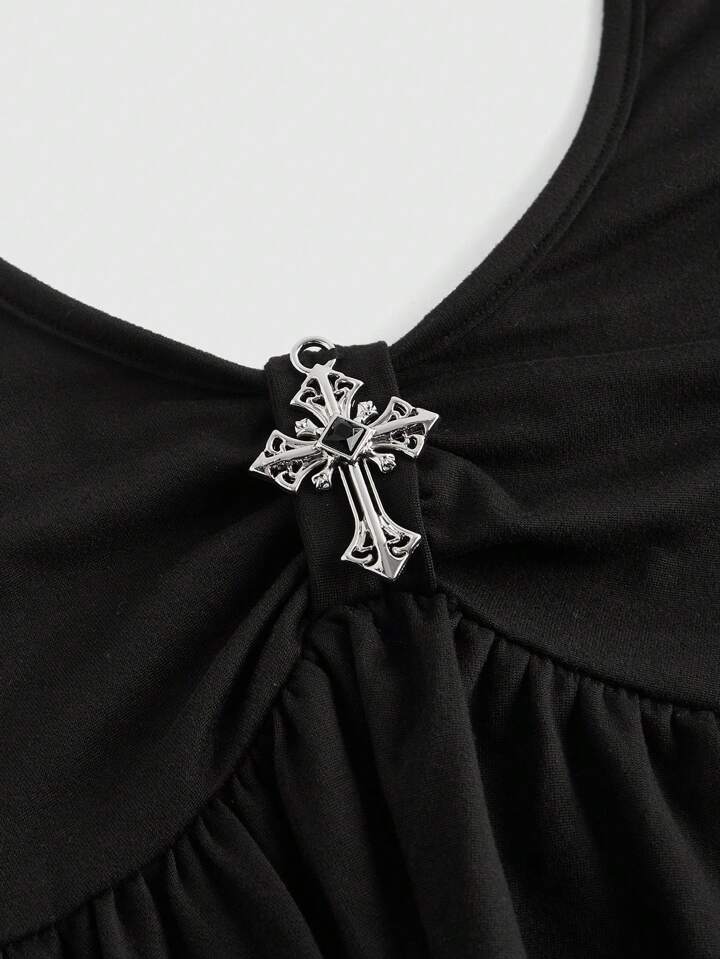 Goth Plus Size Women Punk Cross Decor Halter Neck Tie Front Top, Summer