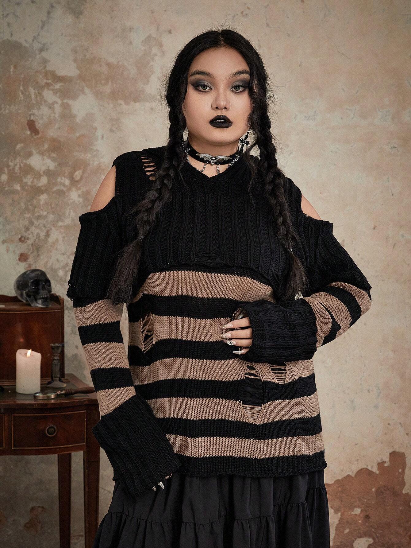Goth Plus Striped Pattern Cold Shoulder Ripped Sweater