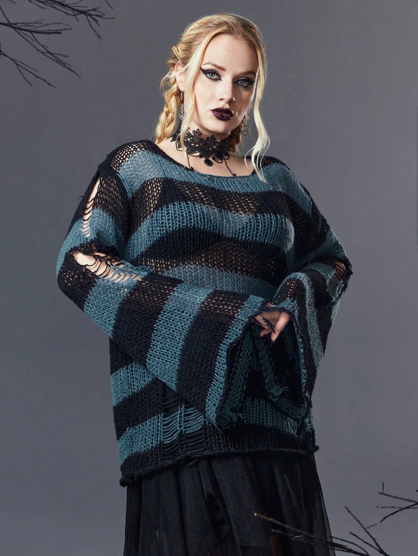 Goth Plus Striped Pattern Flounce Sleeve Distressed Sweater Without Bra
