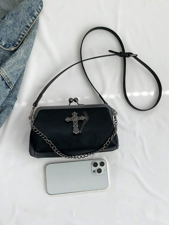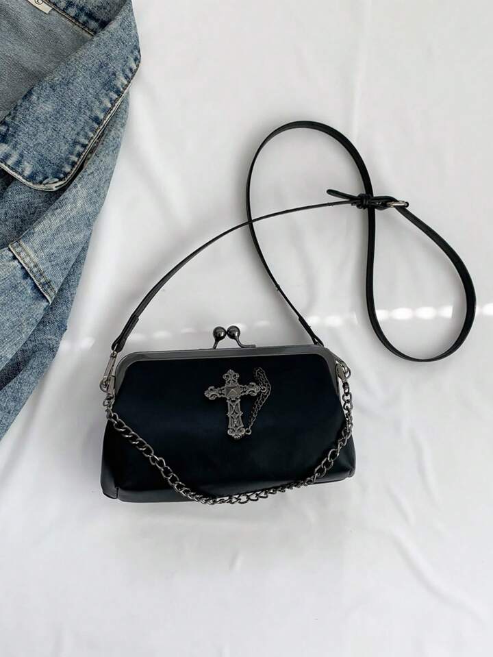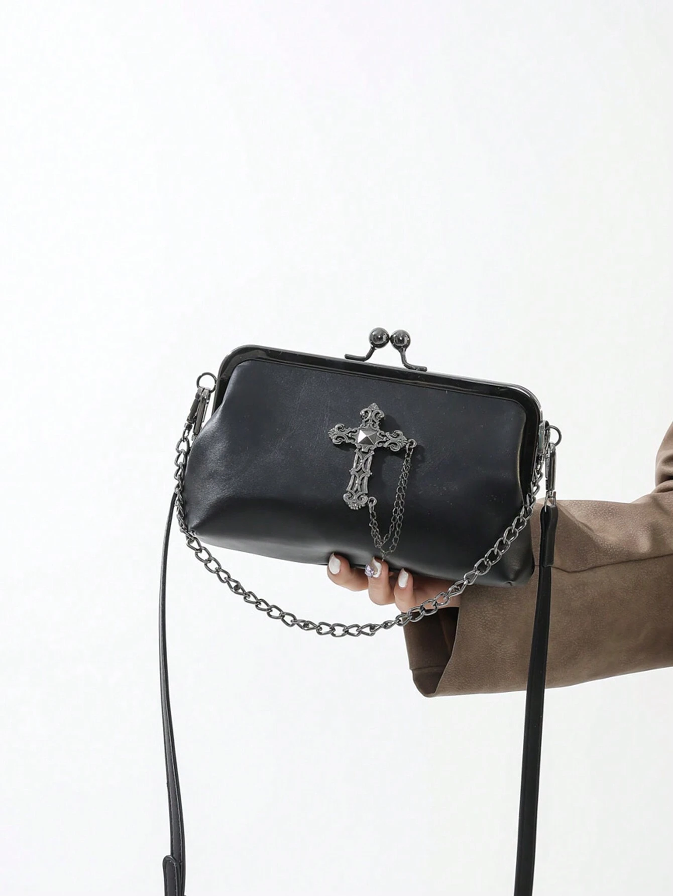 Goth Punk Style Chain Trimmed Skull Detail Clutch/Shoulder/Crossbody Bag