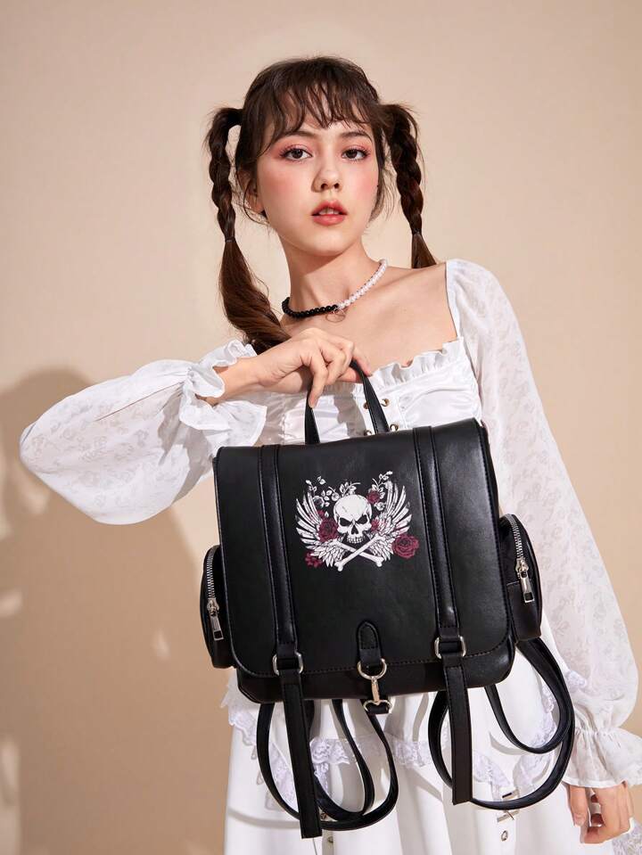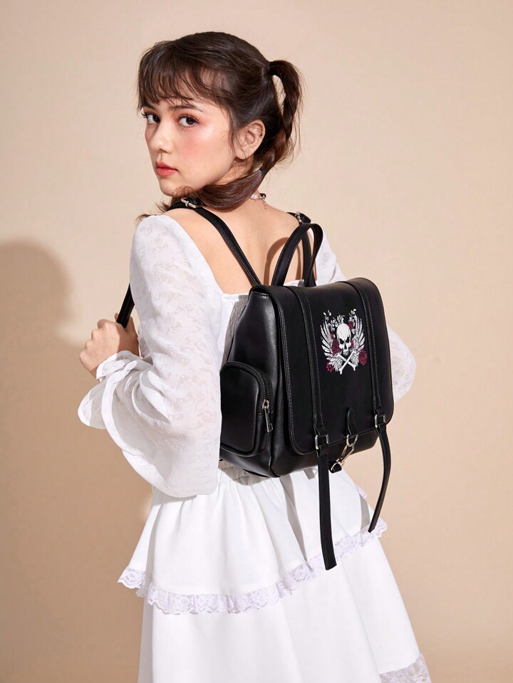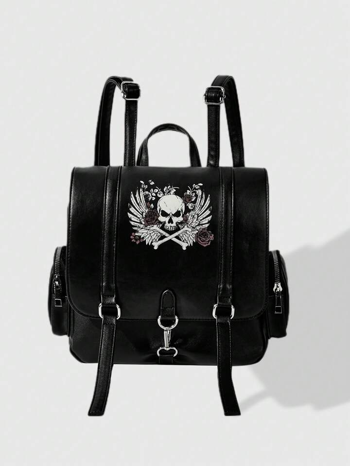 Punk Style Personalized Black Fashion Backpack, Gothic Y2K Campus Skull Unisex Shoulder Bag, Suitable For School