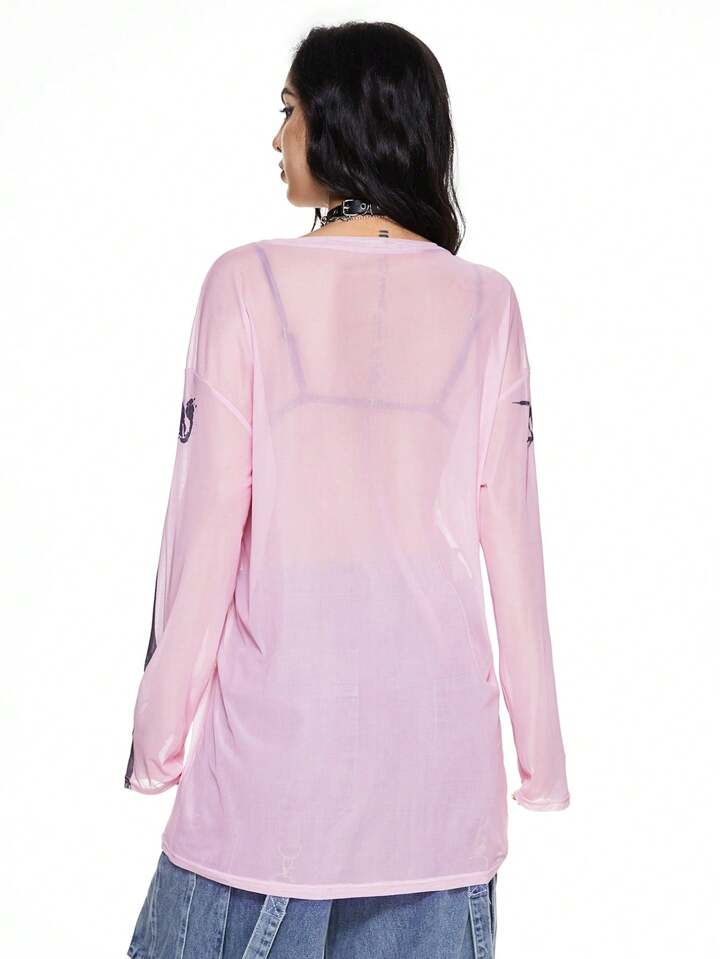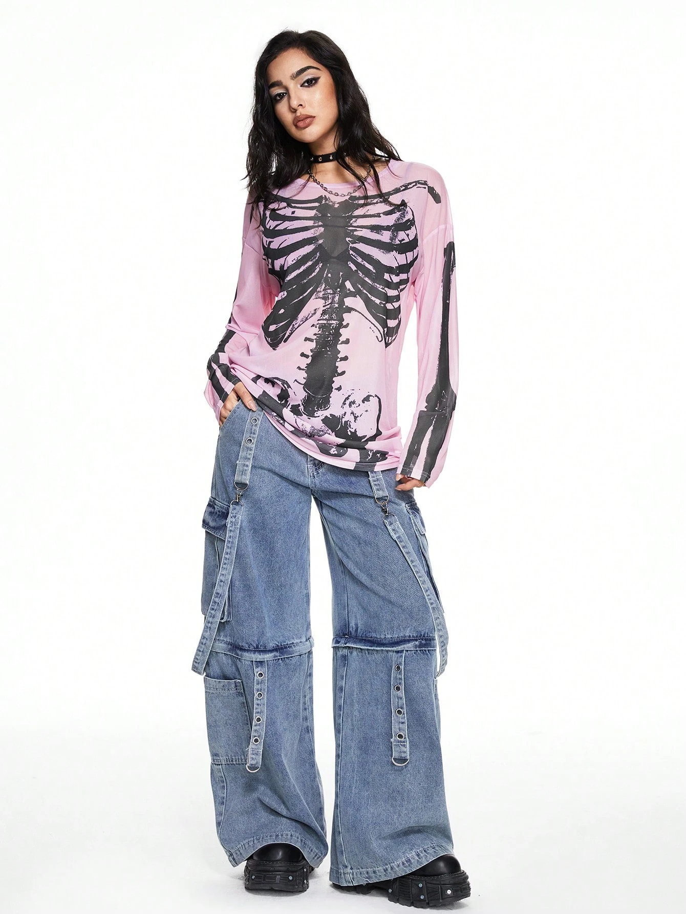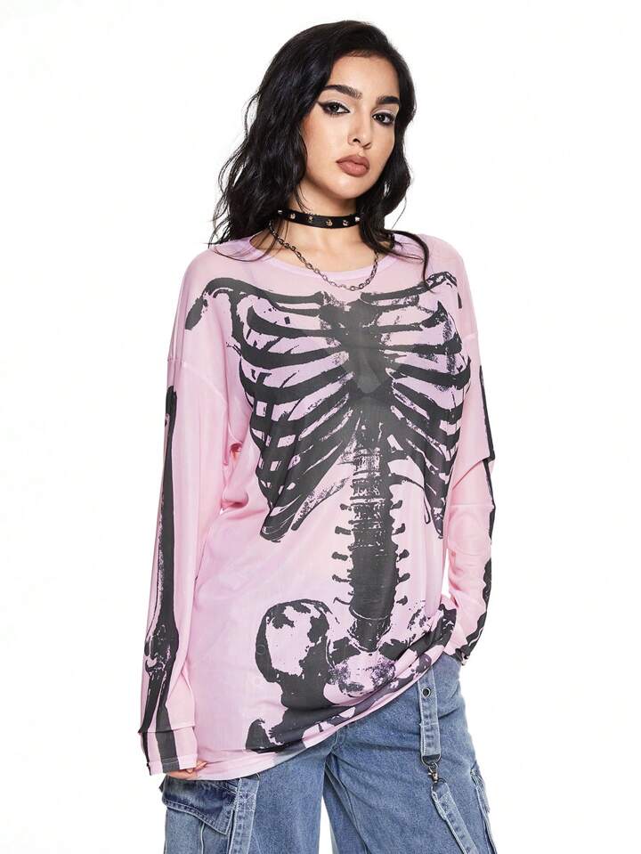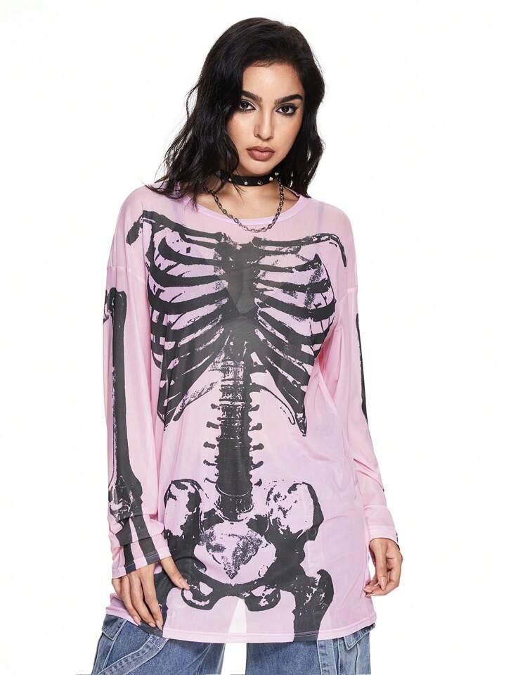 Goth Punk Style Semi-Sheer Valentine's Day Skeleton Print Top, Dark Color