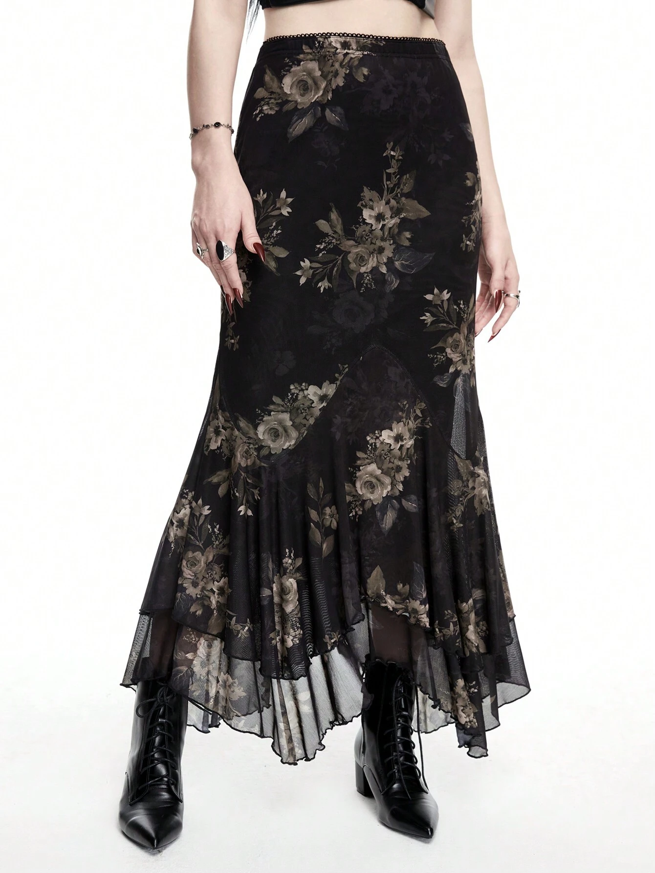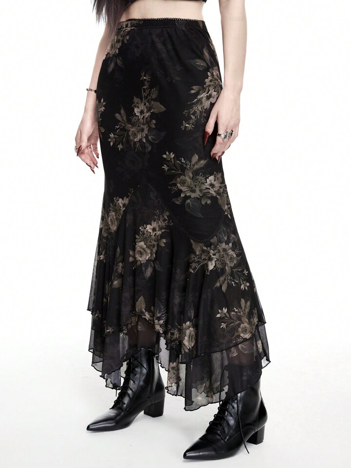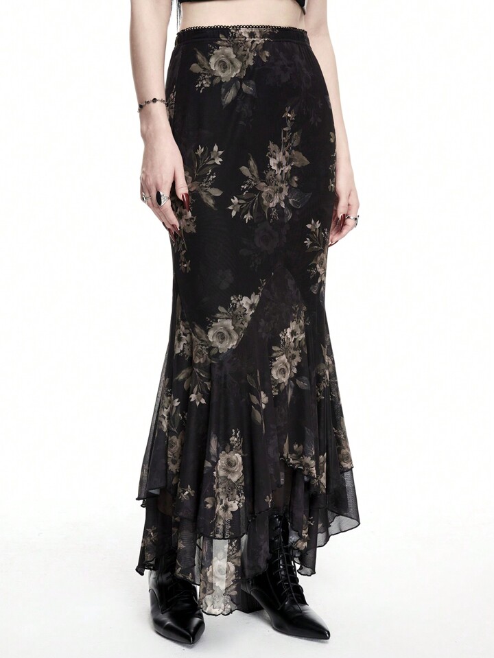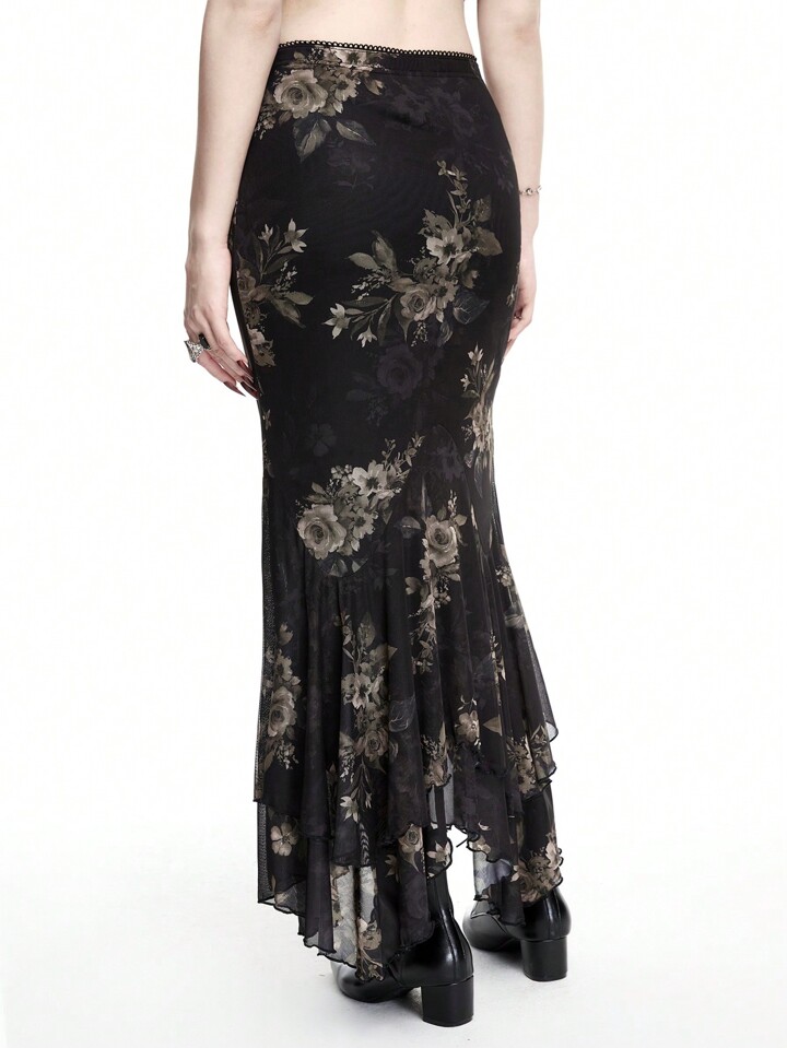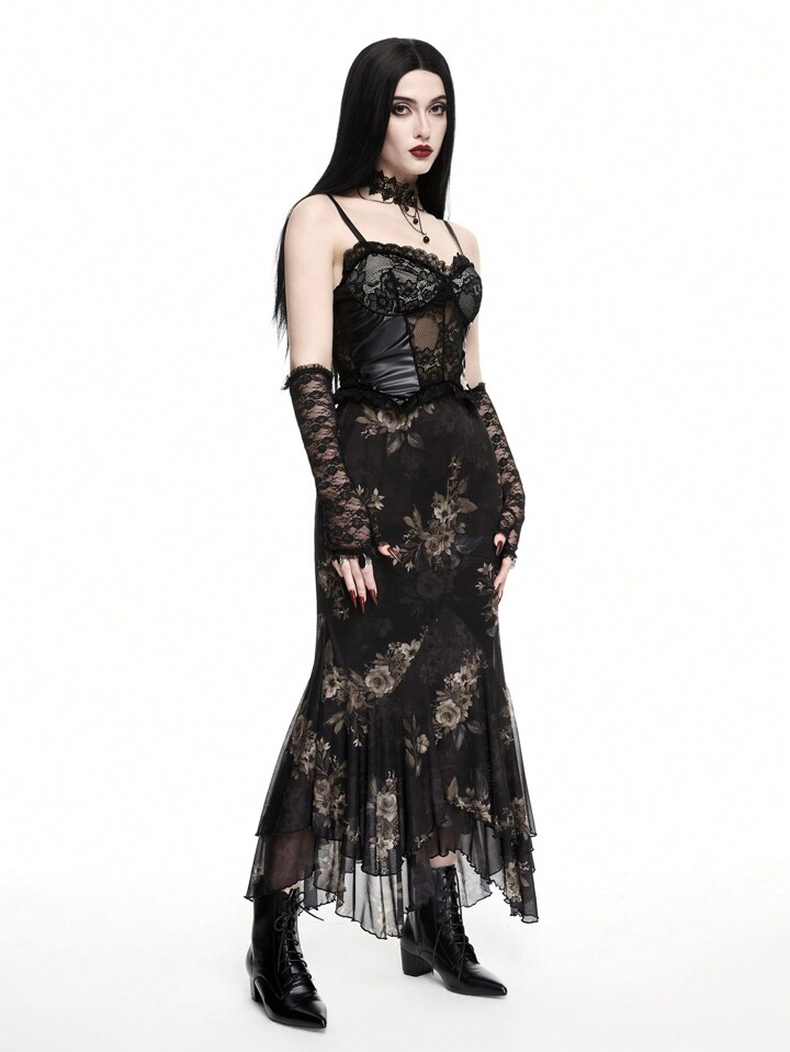 Goth Sexy Lace Floral Print Sheer Mesh Elastic Bodycon Mermaid Skirt Women Knee Length Pencil Skirts For Party Vacations And Leisure