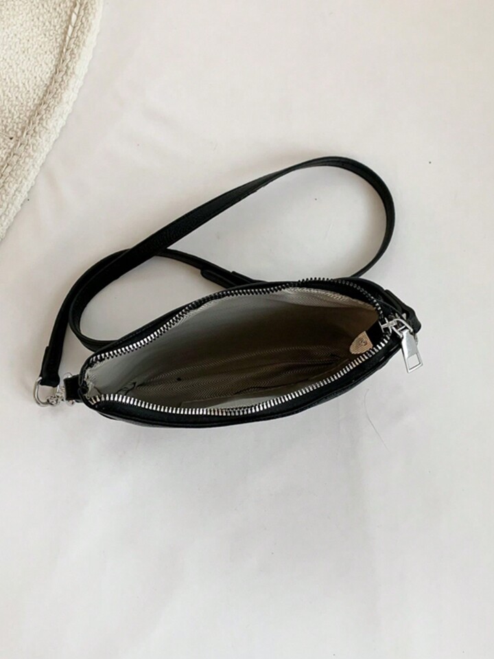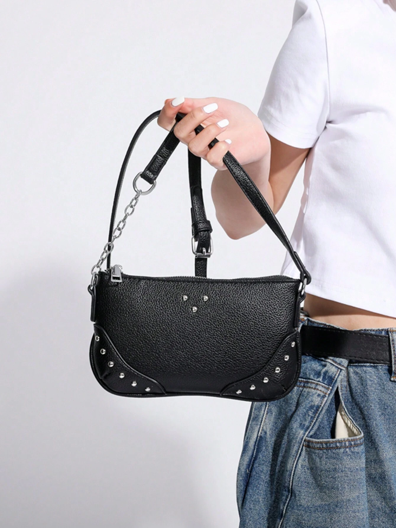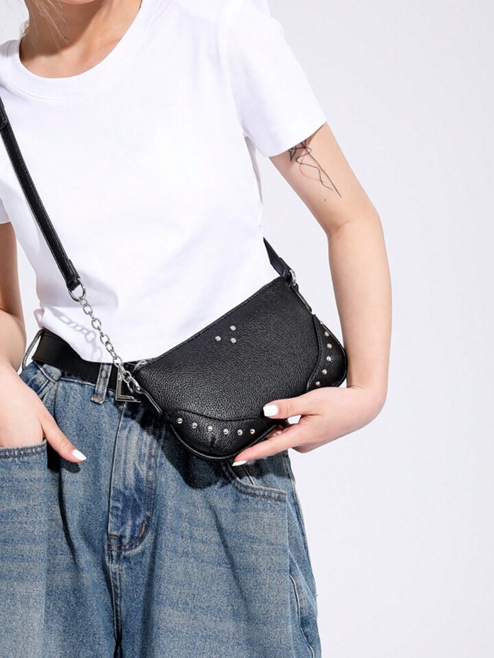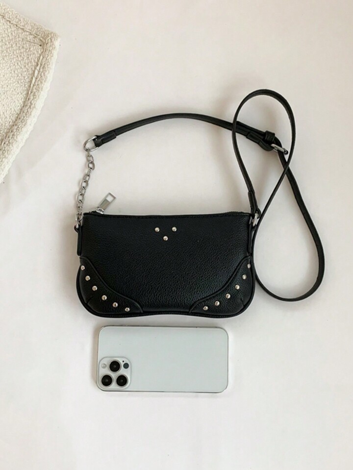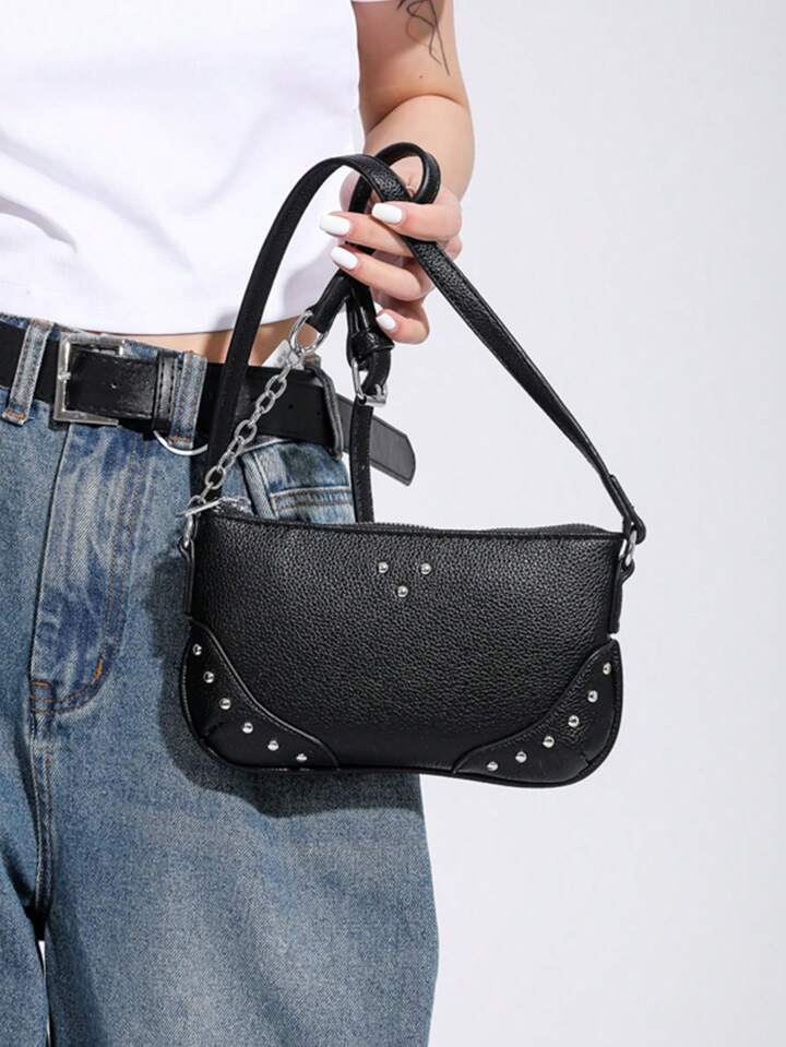 Goth Simple Black Studded Shoulder Bag With Chain Strap For Women, Fashionable And