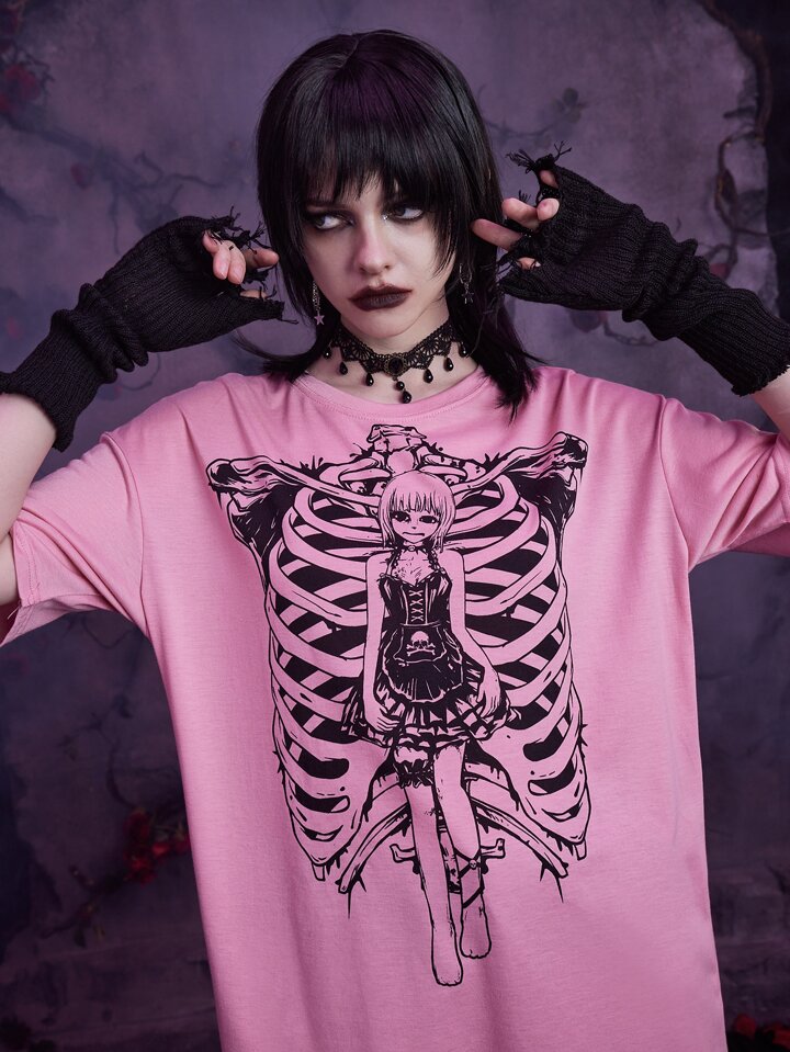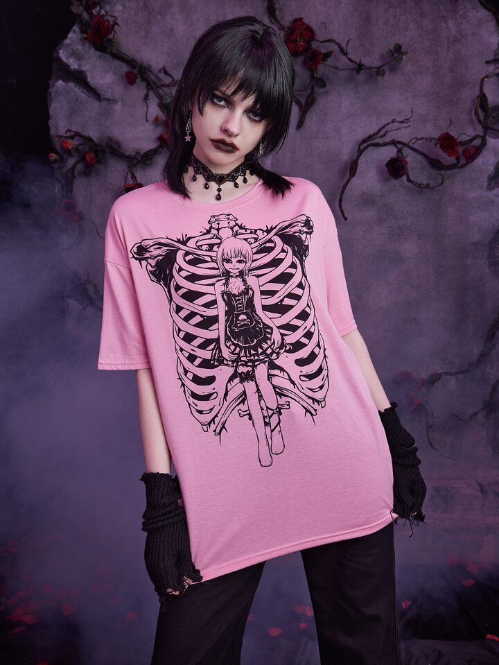 Goth Skeleton Print Drop Shoulder Tee