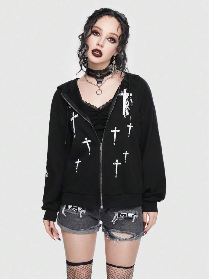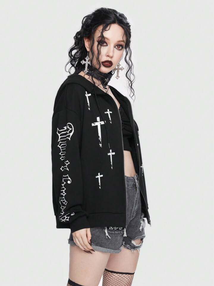 Goth Slogan Skull Graphic Drop Shoulder Hoodie