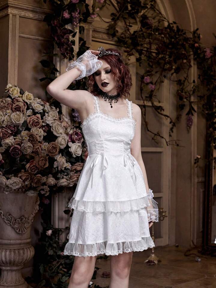 Goth Solid Lace Up Frill Trim Ruffle Hem Cami Dress