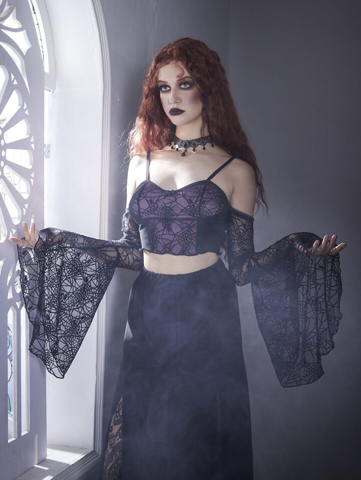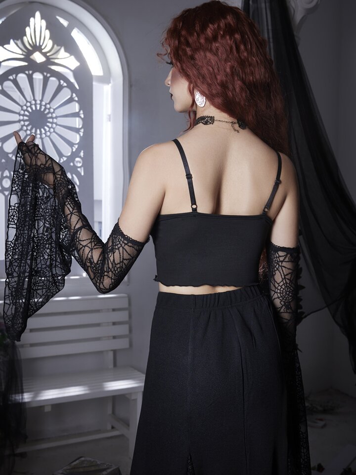 Goth Spider Web Pattern Cold Shoulder Crop Top