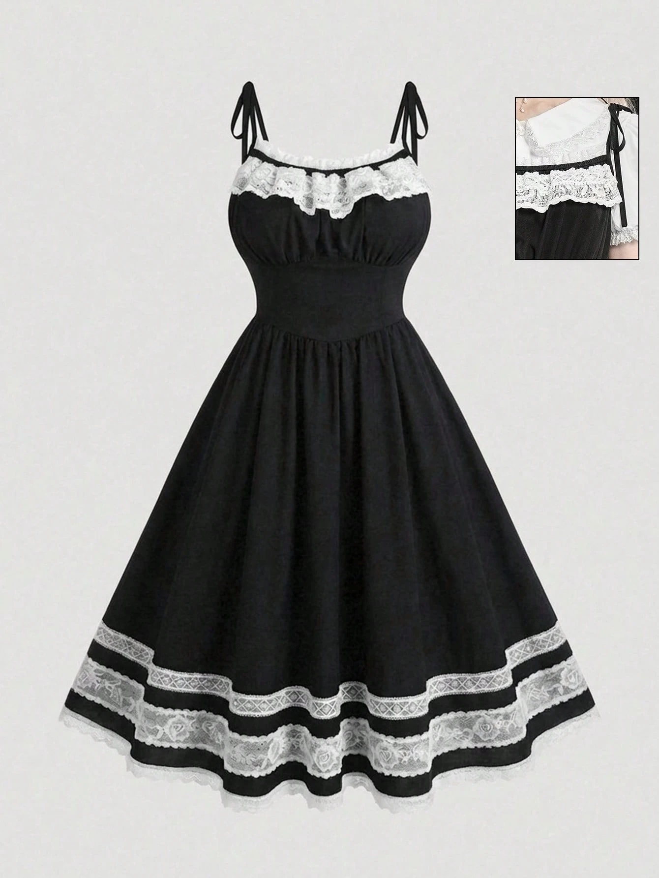 Goth Spring/SummerblackDark Lolita Vintage Elegant Lace Trim Midi Dress For Women, Spring/Summer