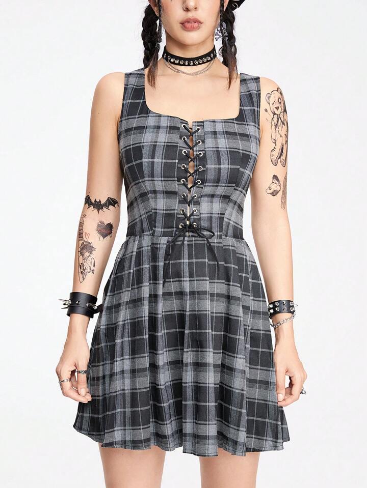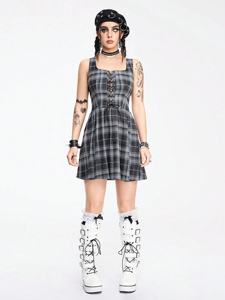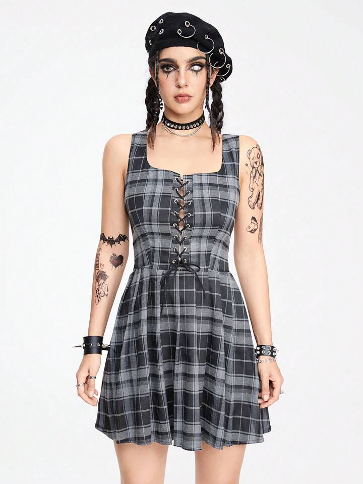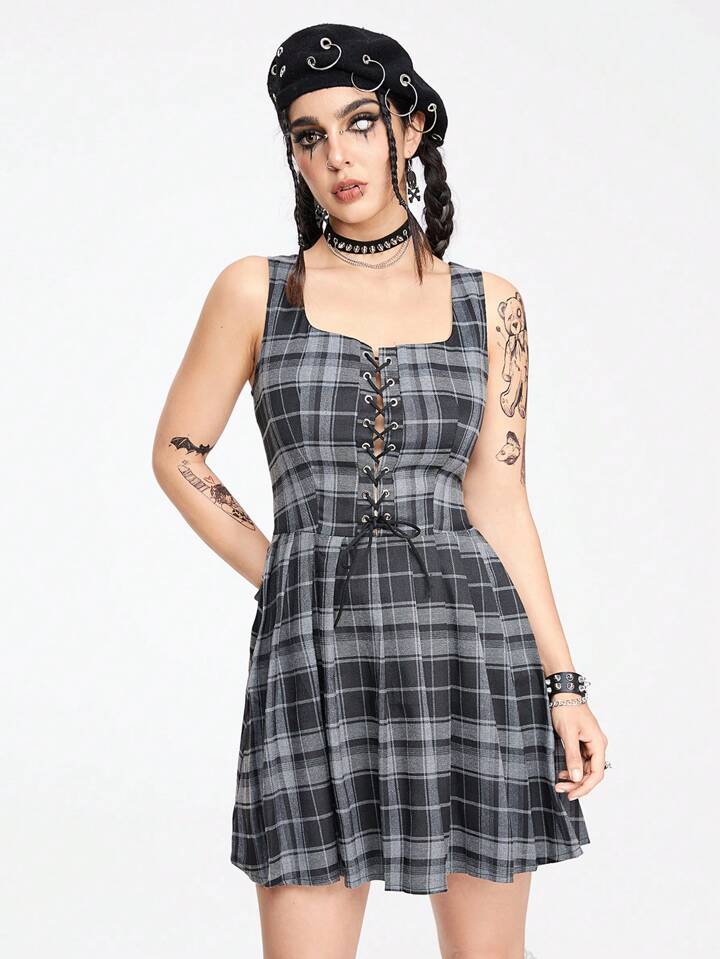 Goth Street Style Millennium Plaid Dress With Bowknot And Gatherings, Slim Fit For Women