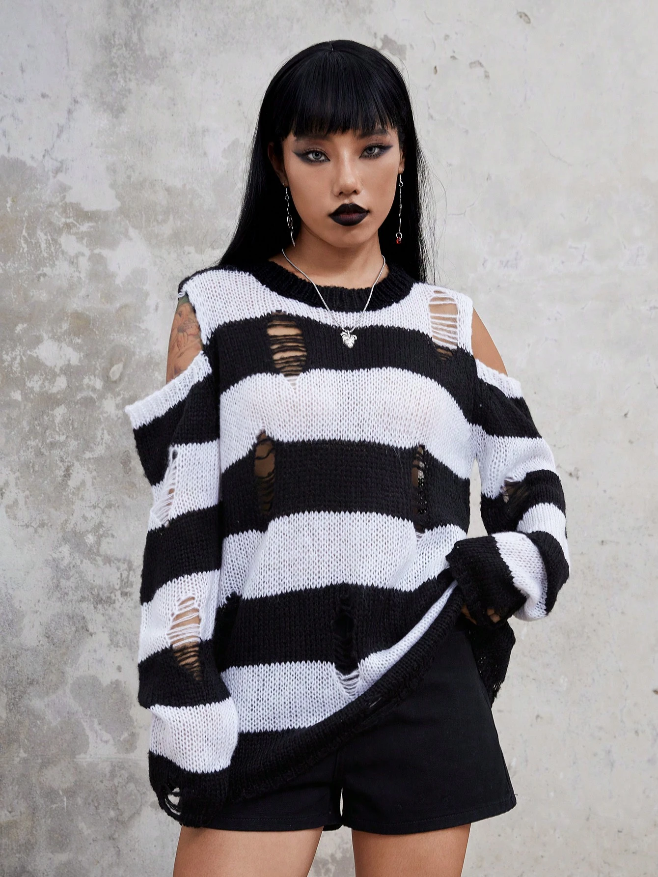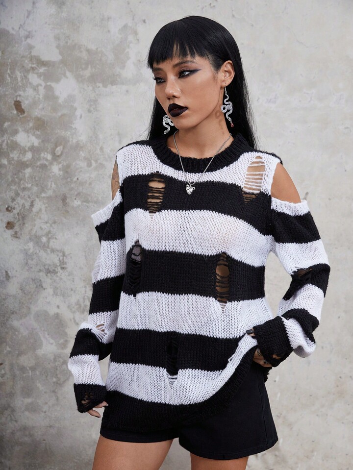 Goth Striped Pattern Cold Shoulder Ripped Sweater