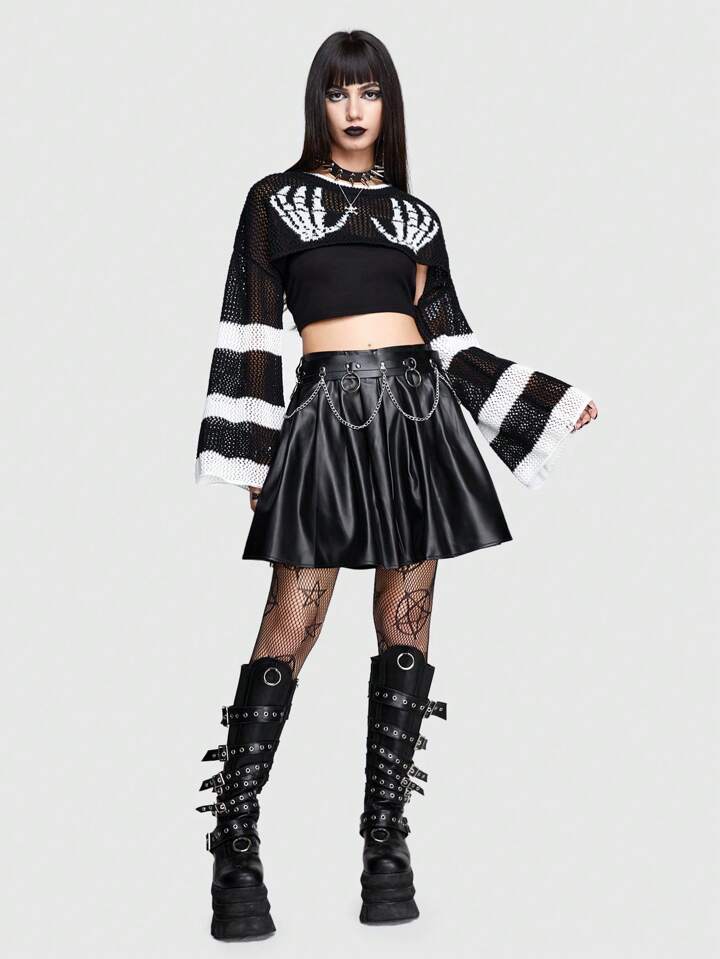 Goth Striped & Skull Hand Pattern Crop Sweater