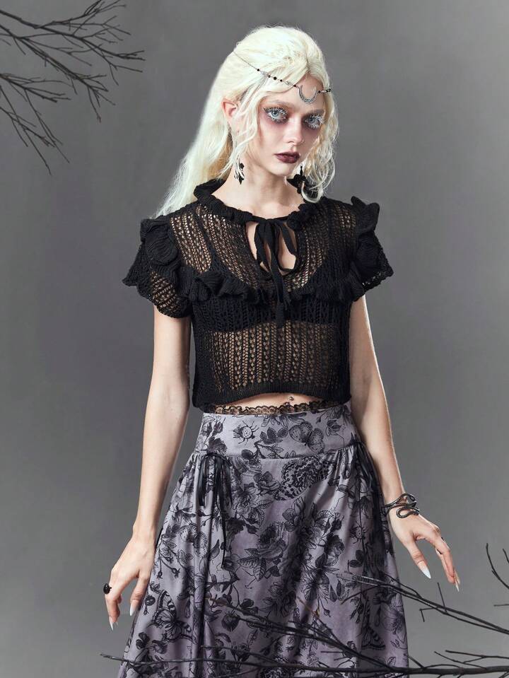 Goth Summer Crochet Beach Hollow Out Lace Trimming Knit Top With Tie Front