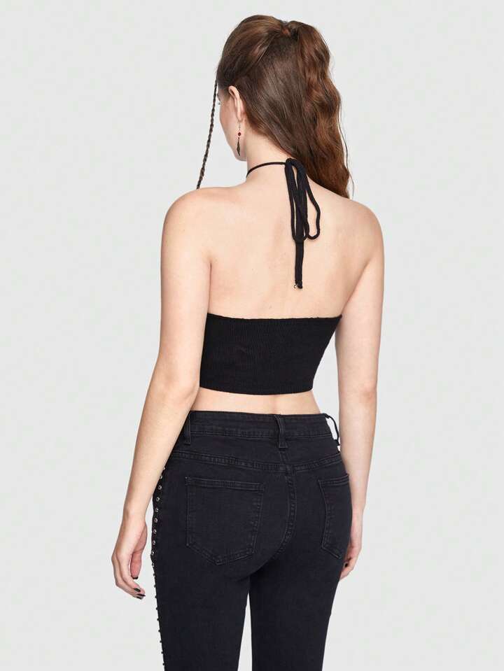 Goth Summer Crochet Beach Solid Ripped Halter Knit Top