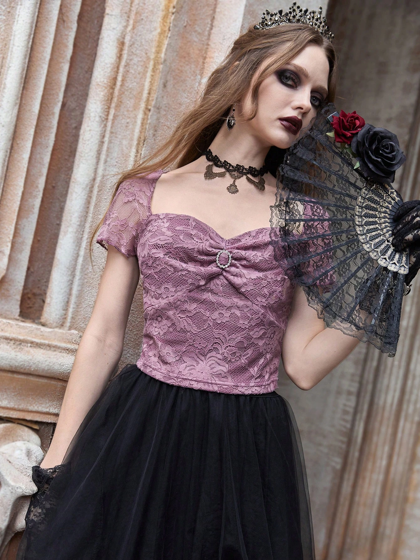 Goth Sweetheart Neck Ruched Front Lace Top