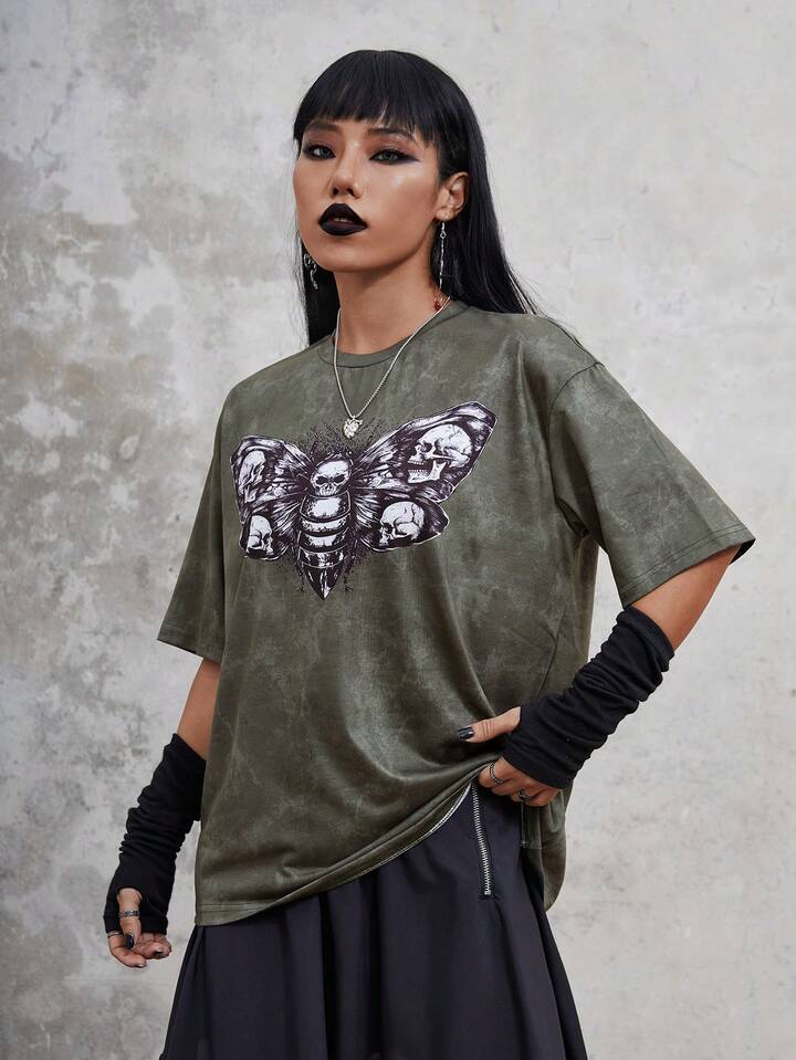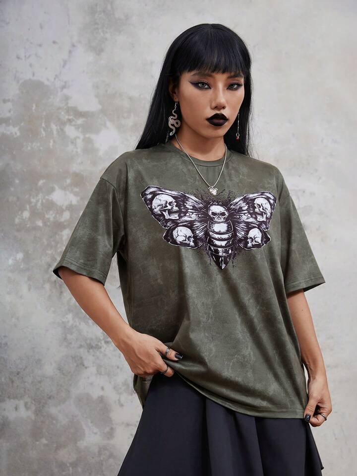 Goth Tie Dye Skull Print Drop Shoulder Tee