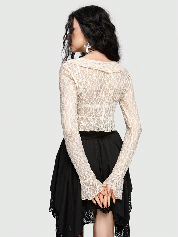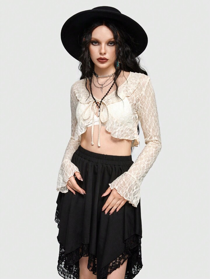 Goth Tie Front Ruffle Trim Flounce Sleeve Crop Top