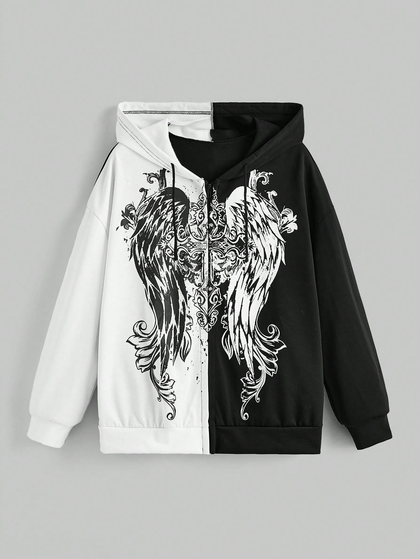Goth Two Tone Wings Print Zip Up Drawstring Hoodie