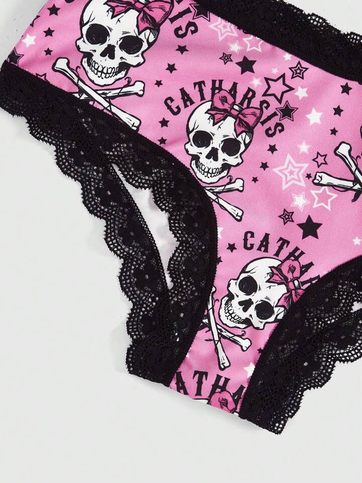 Goth Valentine'S Day 3pcs Skull & Rose & Heart Print Lace Trimmed Triangle Panties Set