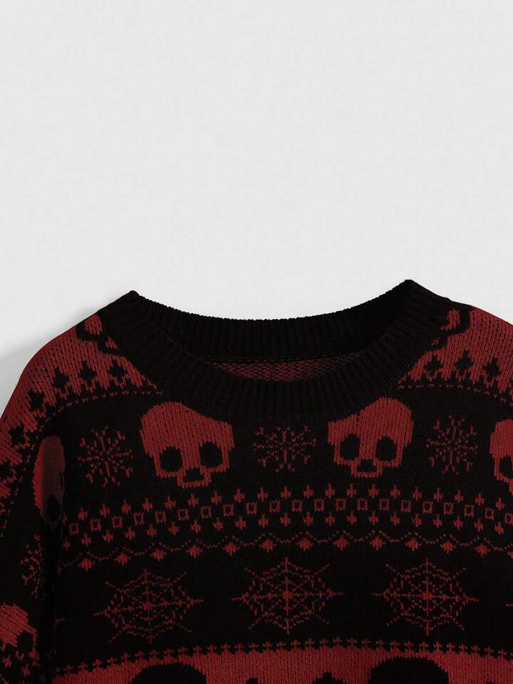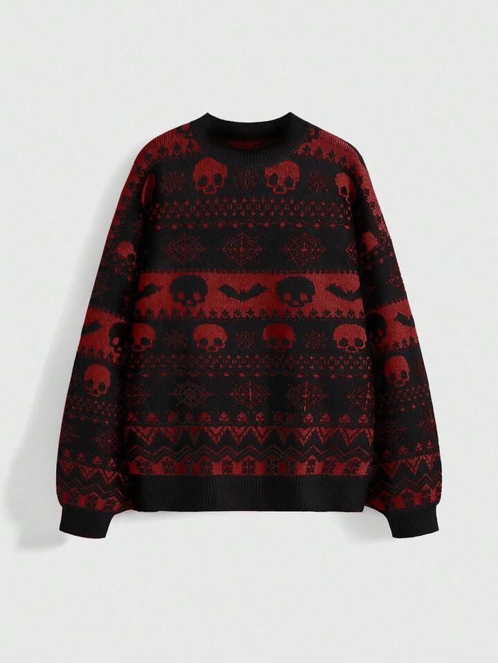 Goth Vintage Dark Skull & Bat Jacquard Knit Sweater For Women, Loose Fit Casual Round Neck Pullover, Autumn/Winter