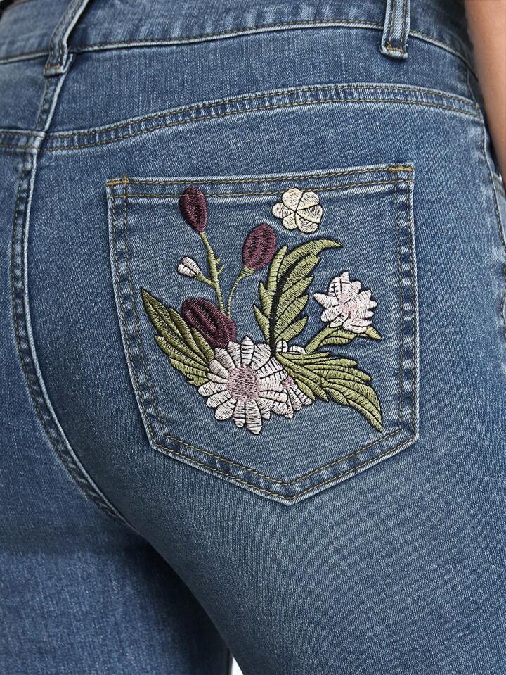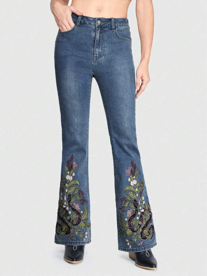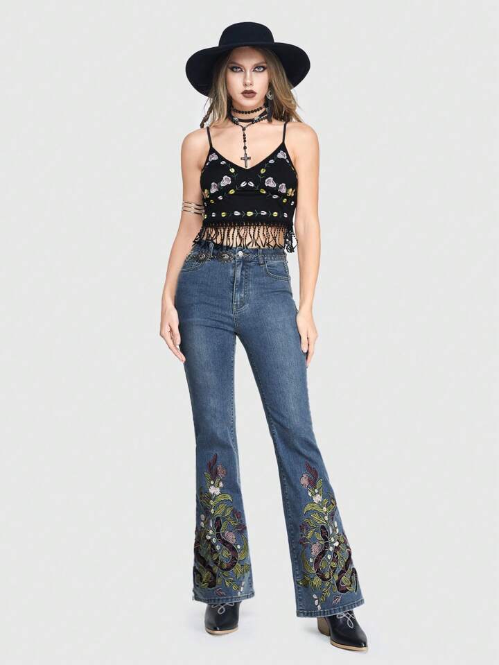 Goth Vintage Flared Embroidered Flared Women's Jeans With Snake, Flower, Leaves Motifs