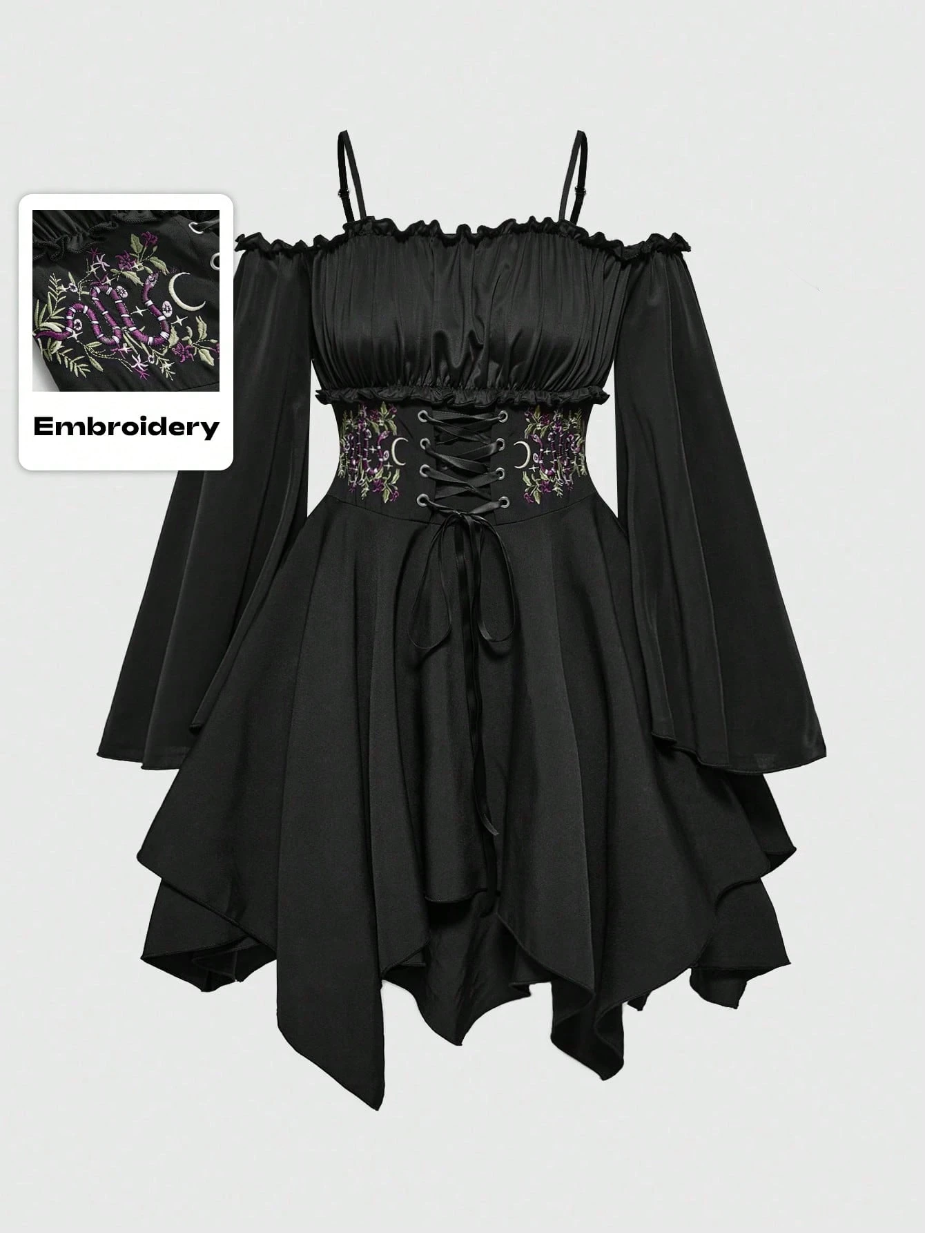 Vintage Gothic Floral Snake Embroidery Off Shoulder Asymmetrical Hem Flare Sleeve Dress