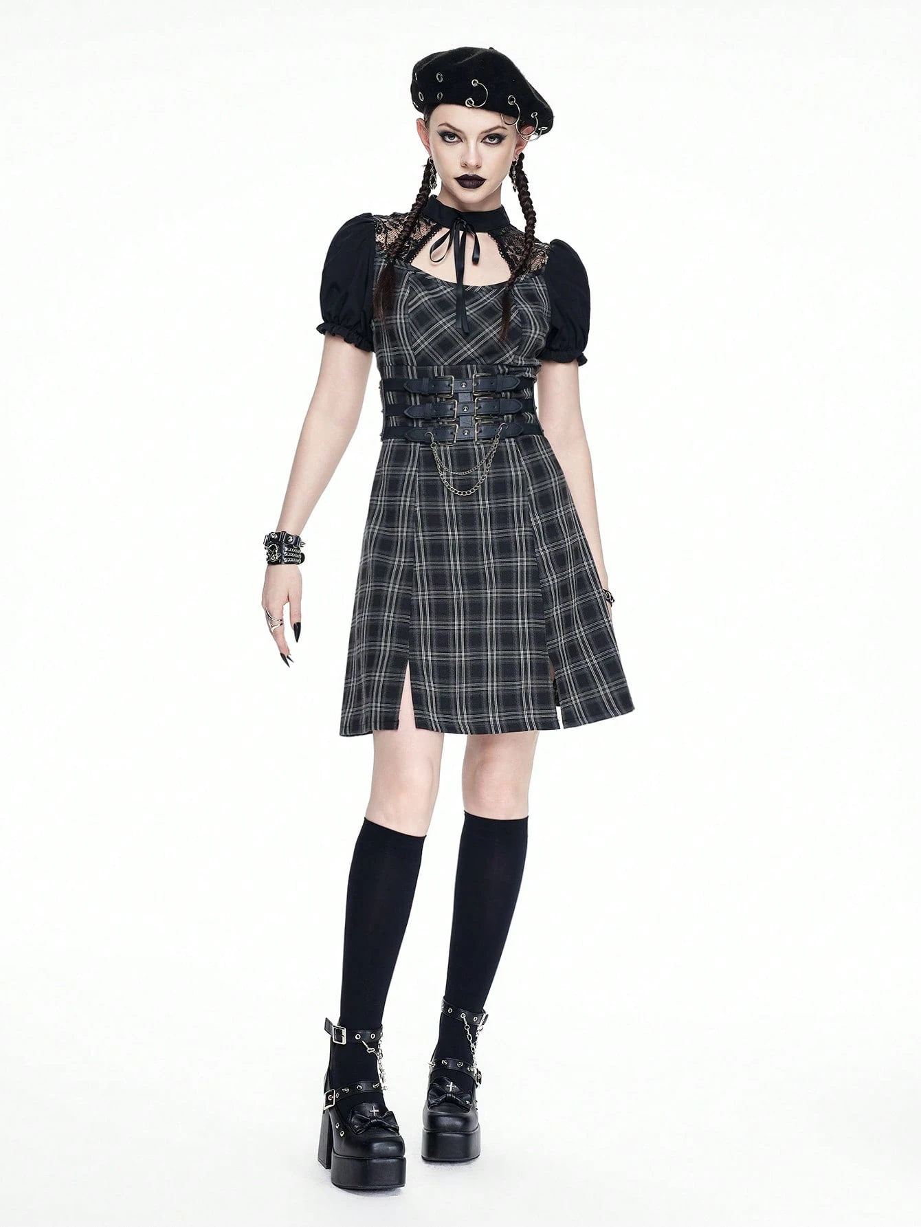 Vintage Gothic Lace Patchwork Plaid Women Mini Dress