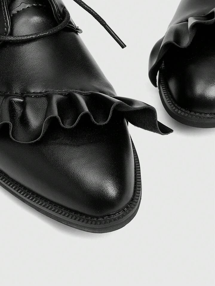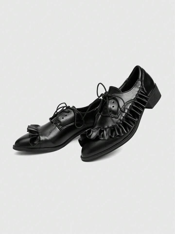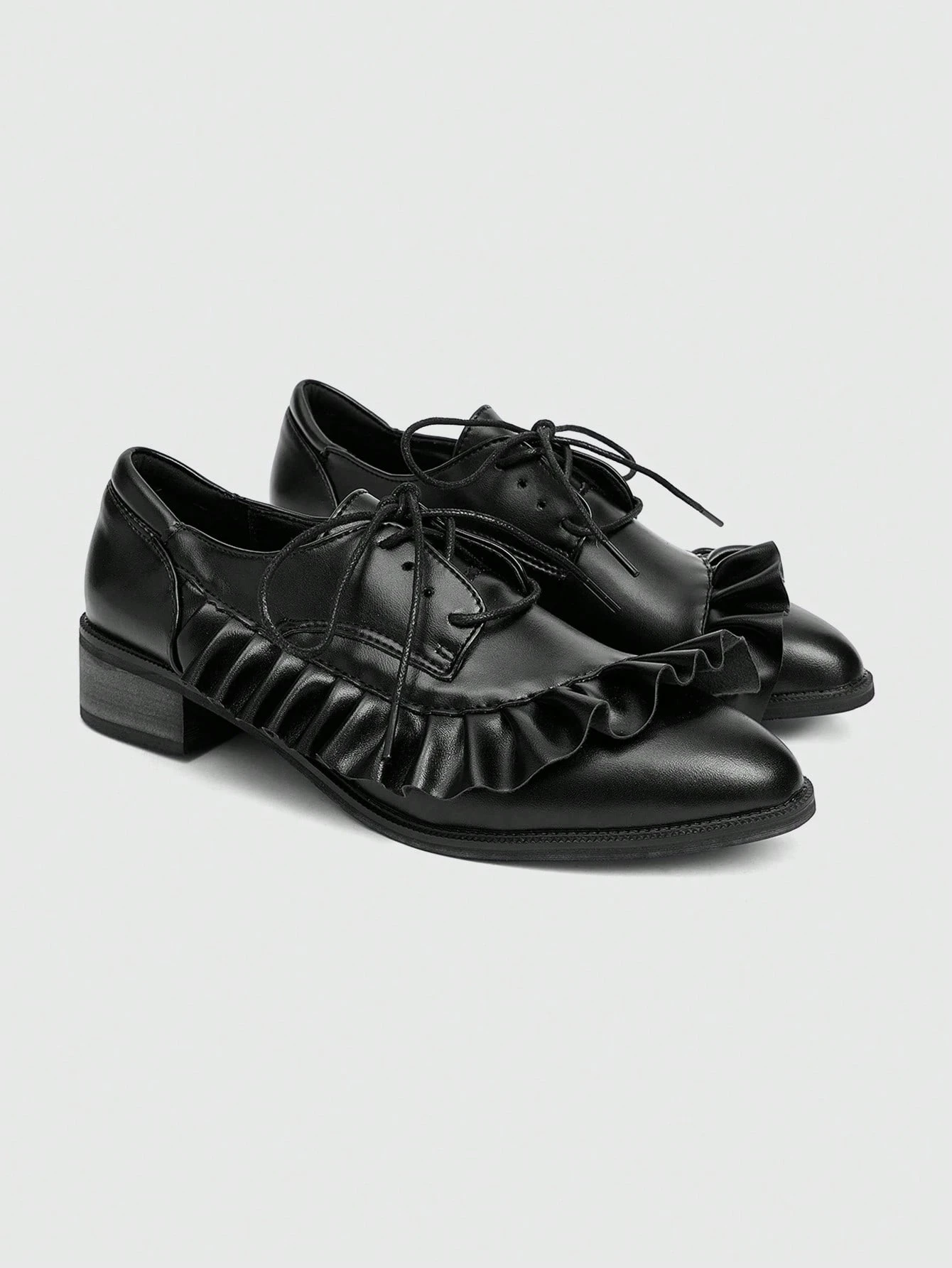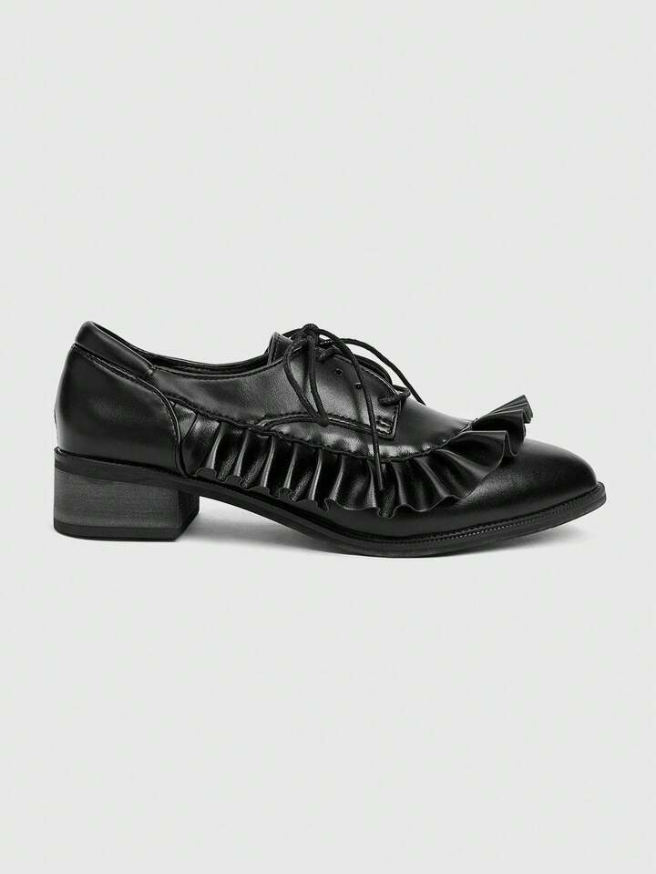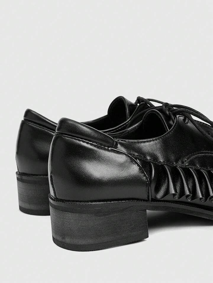 Goth Vintage Pleated Black Leather Shoes, Elegant Lace-Up Design With Chunky Heel, Versatile For Commuting And Dating