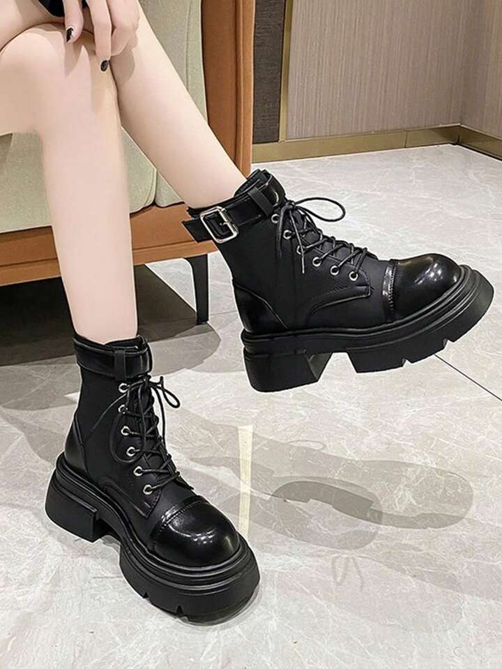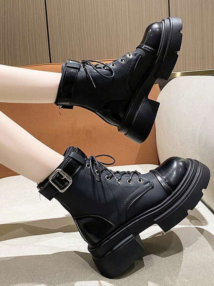 Goth Women Buckle Decor Lace Up Front Combat Boots, Cool Outdoor Fashion Boots