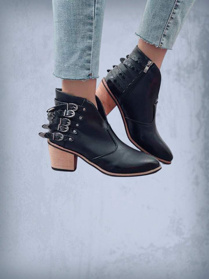 Goth Women Buckle Decor Side Zipper Chunky Boots, Cool Outdoor Fashion Boots