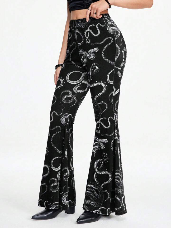 Women Halloween Dark Gothic Velvet Snake Allover Print Flared Hem Elastic Waist Pants