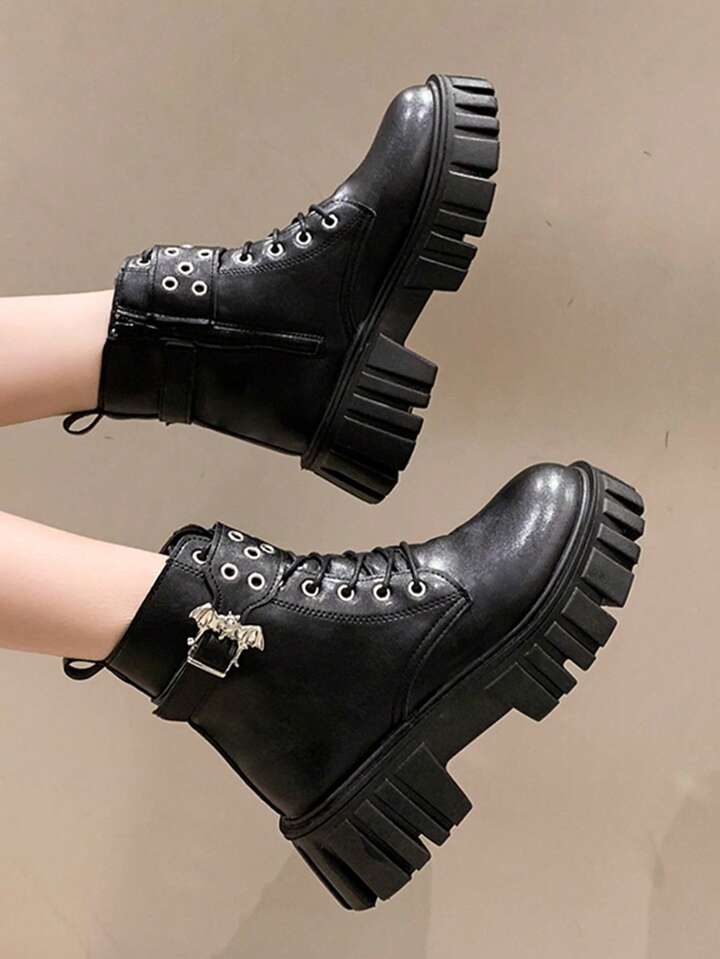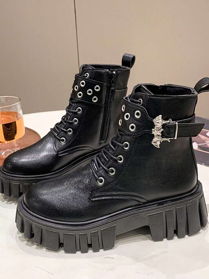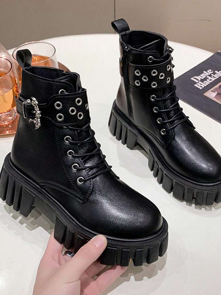 Goth Women Solid Buckle Decor Lace Up Front Combat Boots, Punk Outdoor Fashion Boots