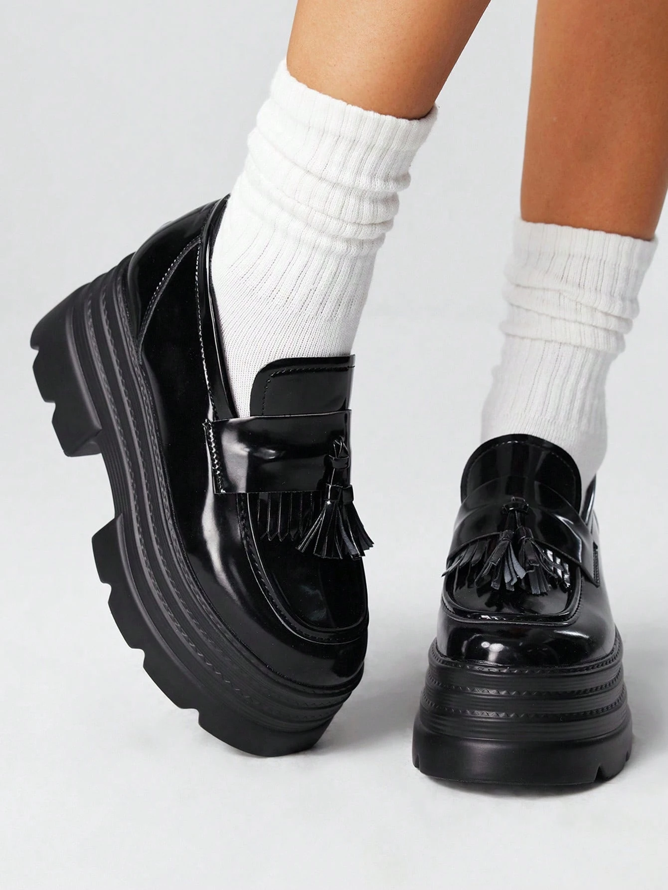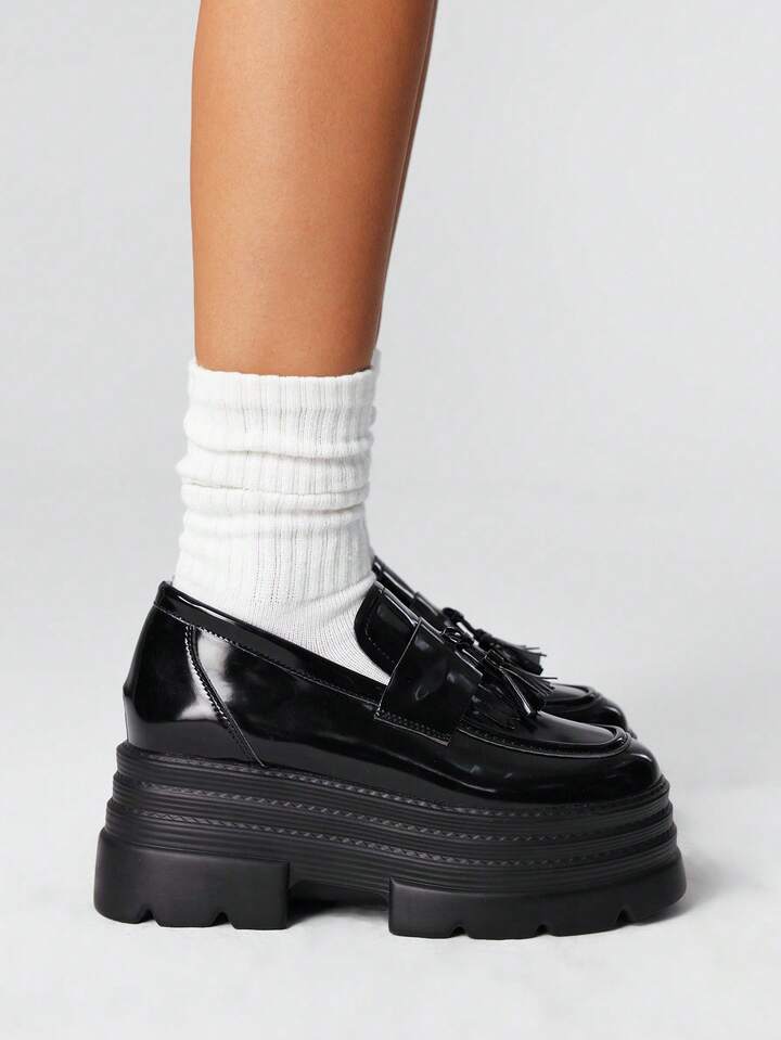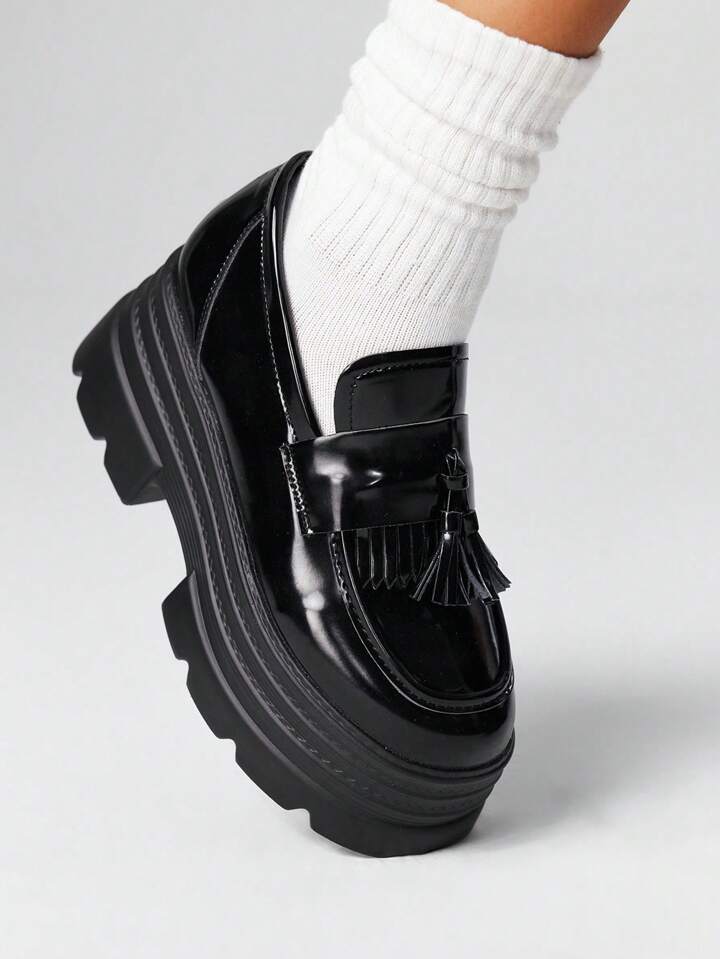 Goth Women's Black Leather Mary Jane Slip-On Loafers, Japanese School Uniform Style Shoes, Dress/Work Pumps With Platform & Chunky Heel
