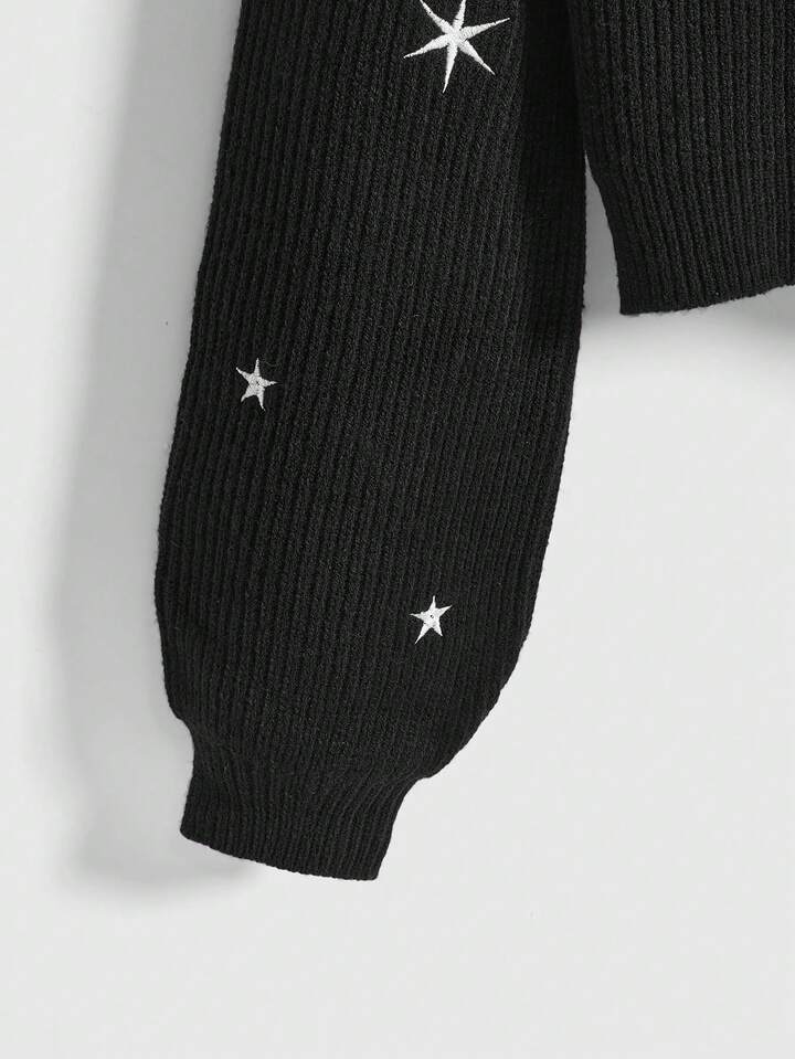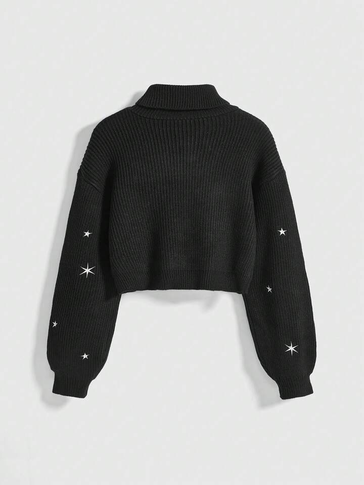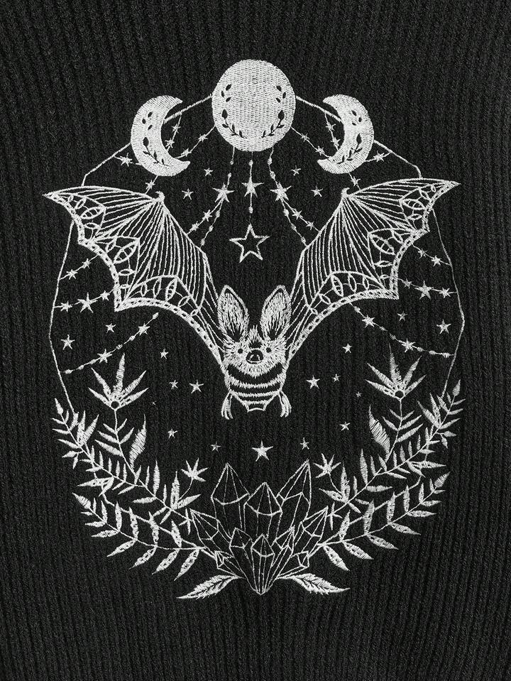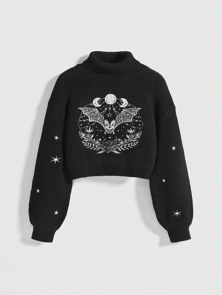 Goth Women's Casual Bat & Plant Pattern Dropped Shoulder Long Sleeve Turtleneck Sweater, Autumn/Winter