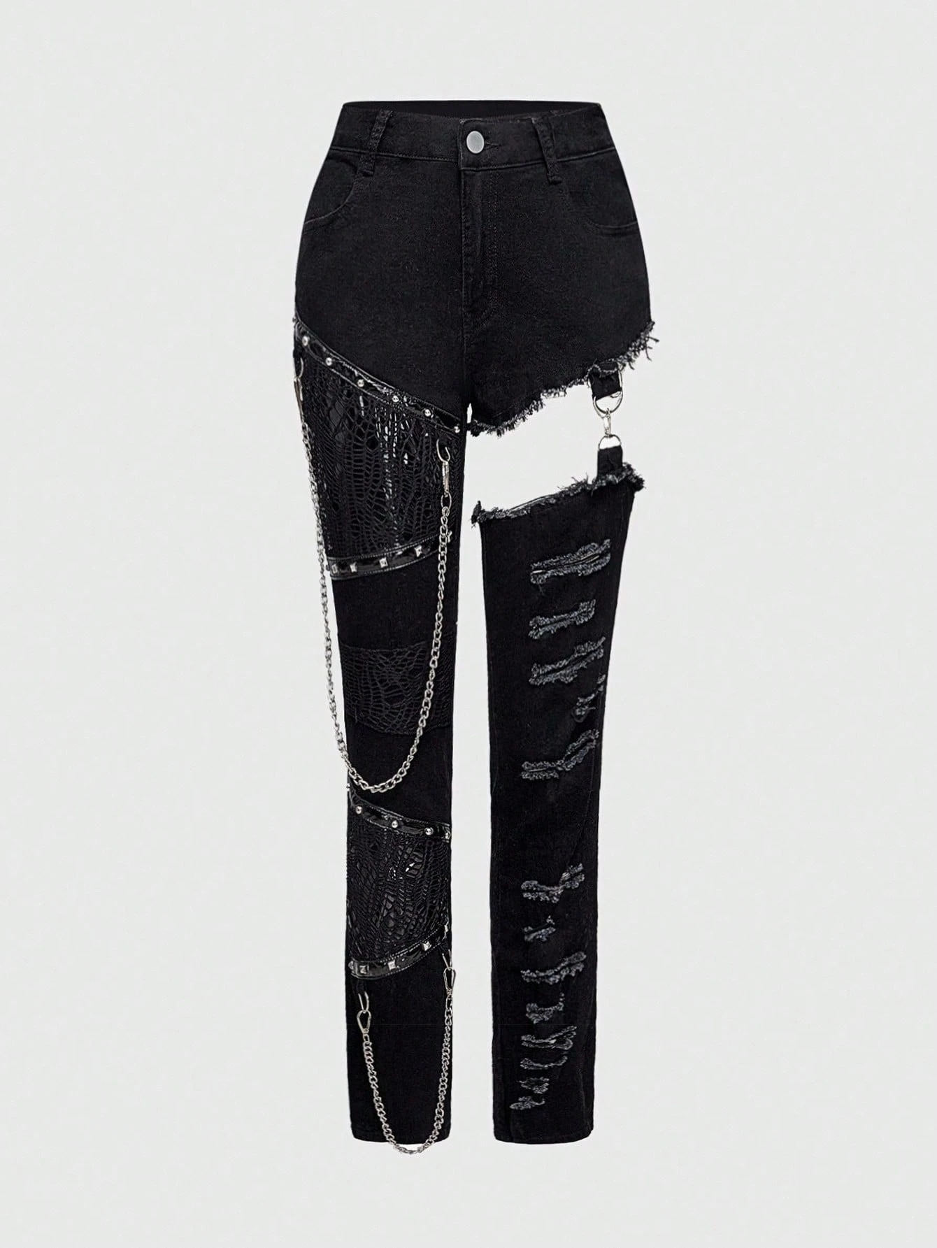 Women's Kpop Dark Punk Gothic Rivet Chain Decor Hollow-Out Patchwork Distressed Skinny Jeans