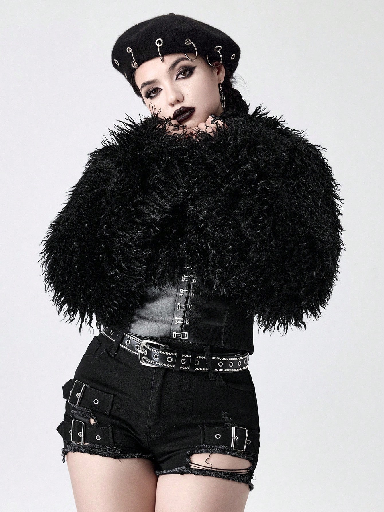 Goth Women's Faux Fur Patchwork PU Leather Short Jacket, Autumn/Winter
