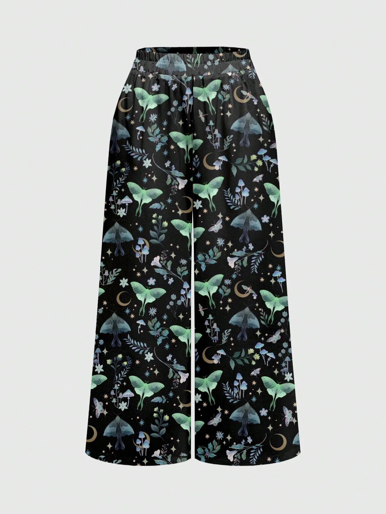Women's Gothic Dark Mysterious Witch Moth Leaf Plant Butterfly Snake Sun Moon Star Allover Print Loose Wide Leg Pants