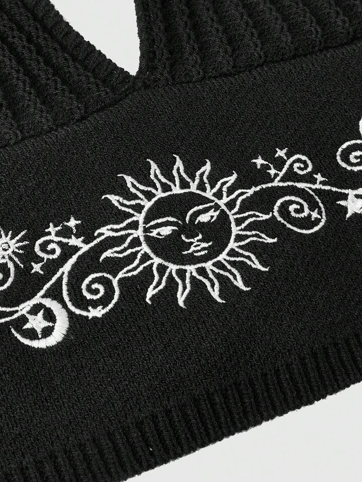 Women's Gothic Style Sun & Human Face Print Crochet Knit Top With Halter Neck For Vacation