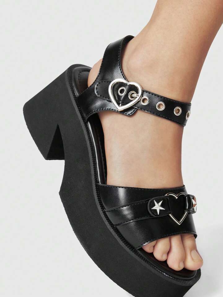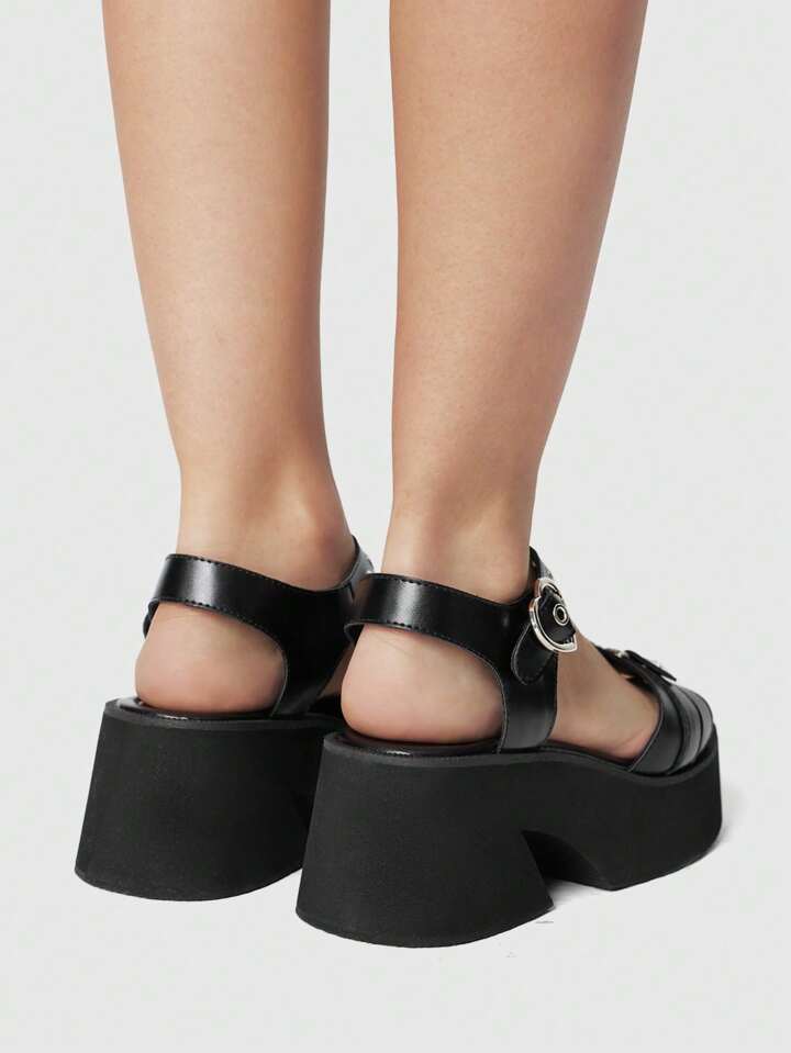 Goth Women's Multi-Strap Buckle Design Round Toe Chunky Platform Wedge Roman Sandals, Punk Style PU Material Black, Suitable For Graduation Photos And Office Wear Spring Shoes Spring Break Easter