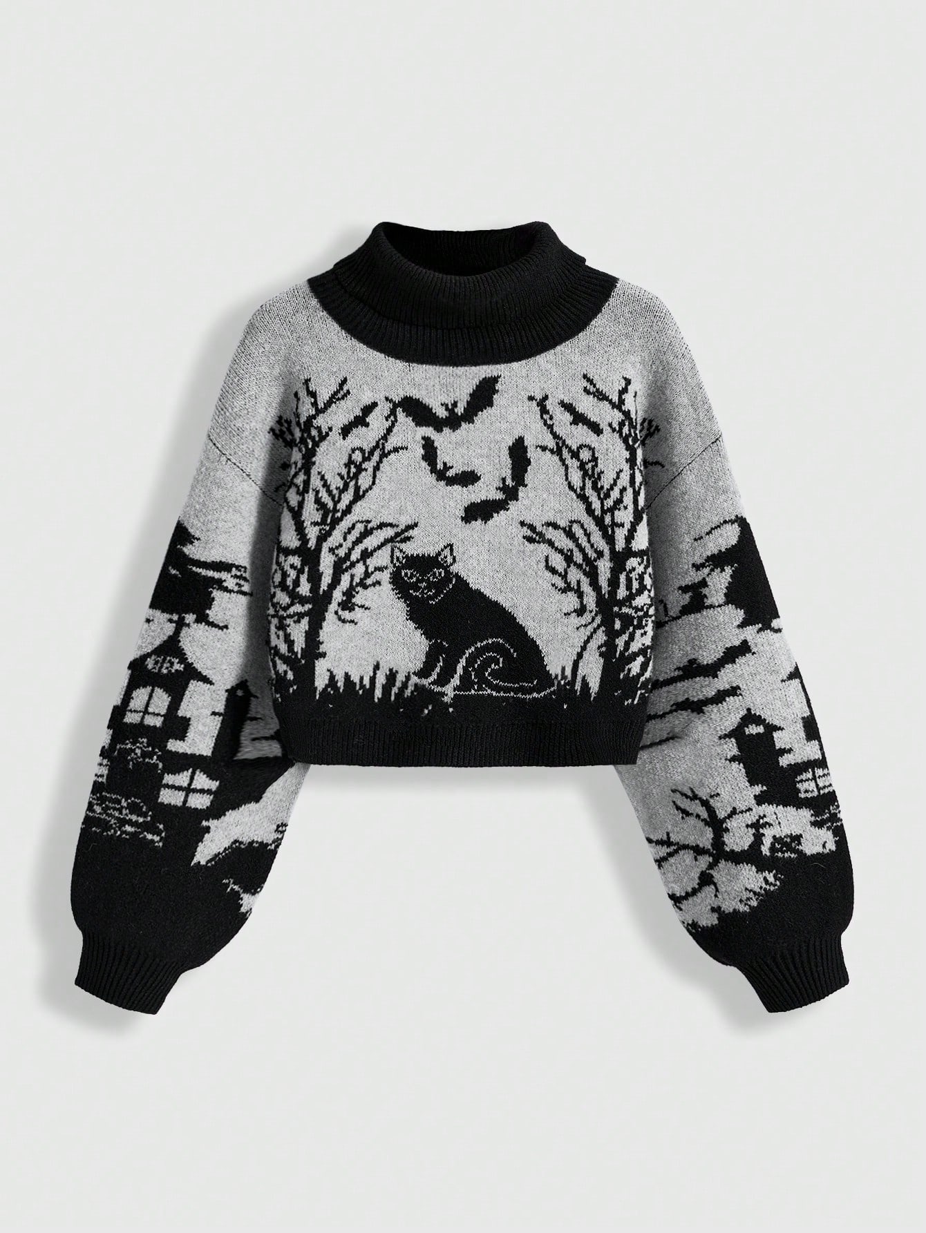 Women's Retro Halloween Gothic Contrast Color Turtleneck Witch Castle Black Cat Jacquard Knit Sweater