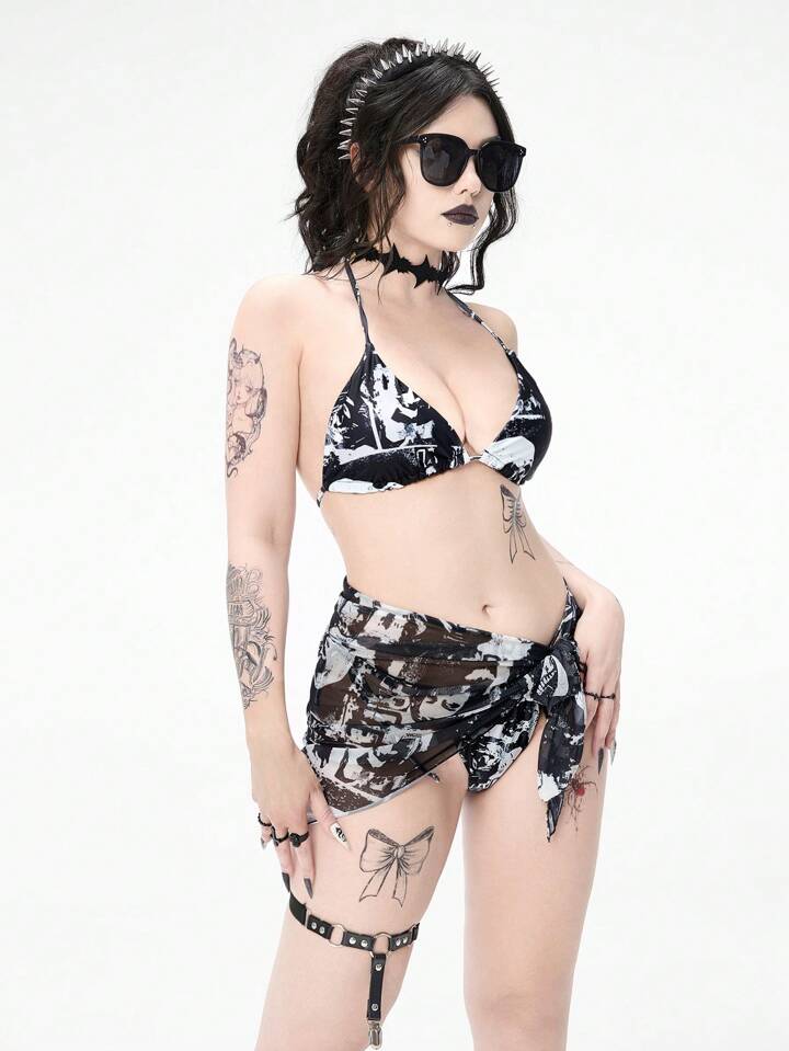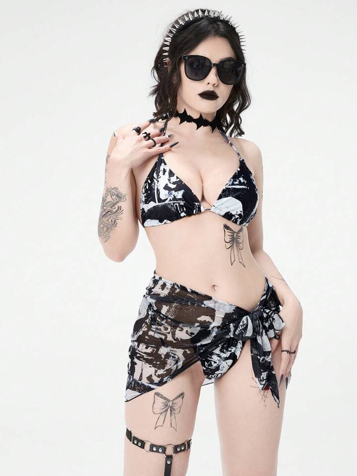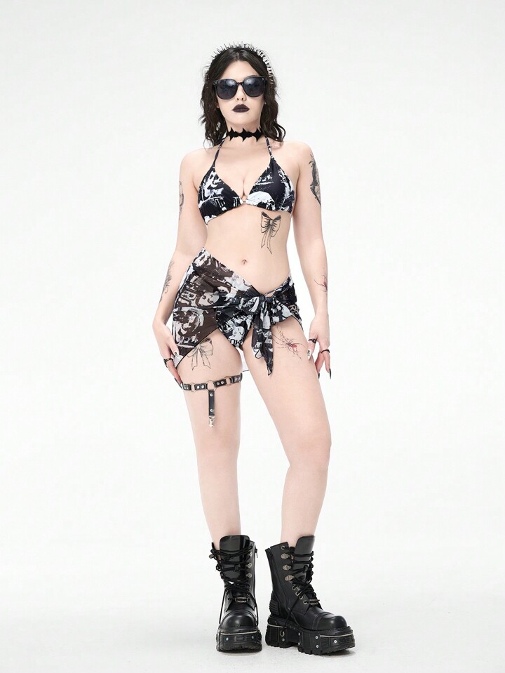 Goth Women's Skull Printed Halter Neck Tie Sexy Bikini Set With Matching Cover-Up Skirt, For Summer Beach Vacation