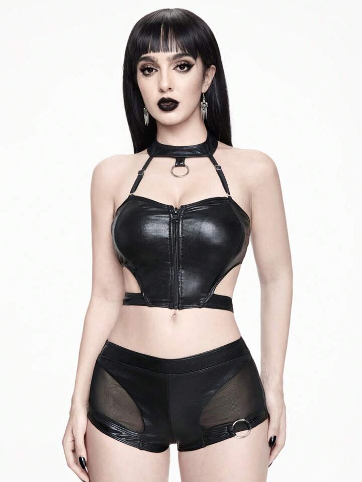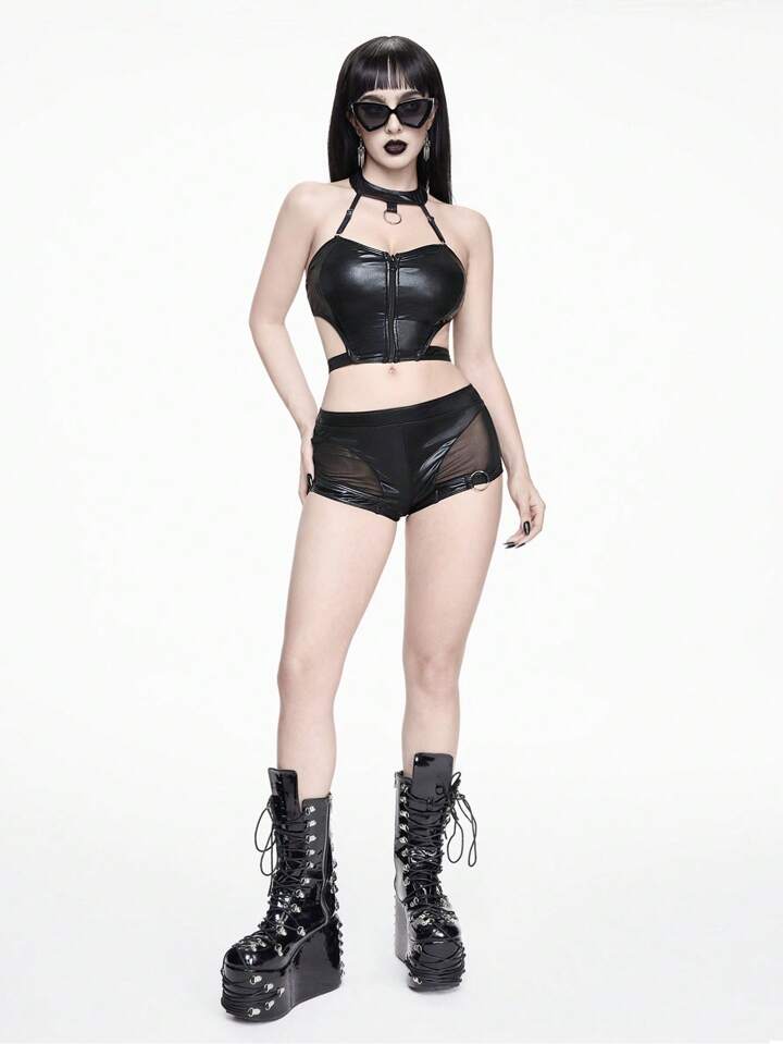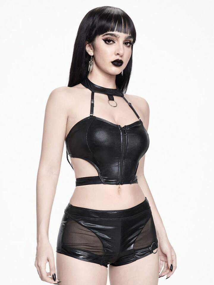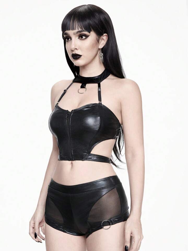 Goth Women's Solid Color Zip Front Bikini Set With Hollow Out Waist, Halter Neck, Sexy And Fashionable Summer