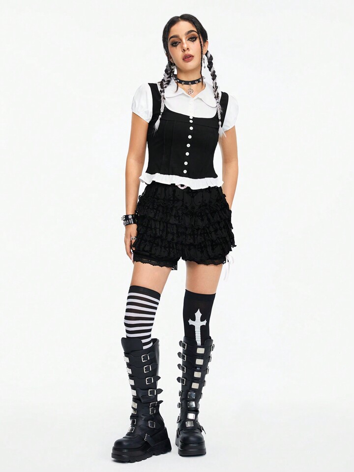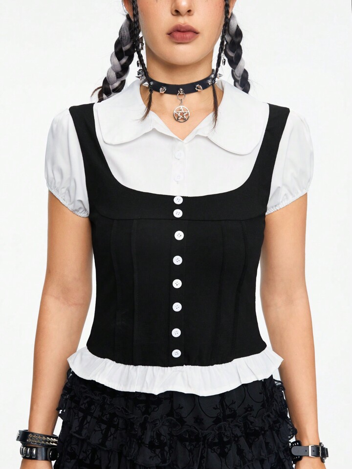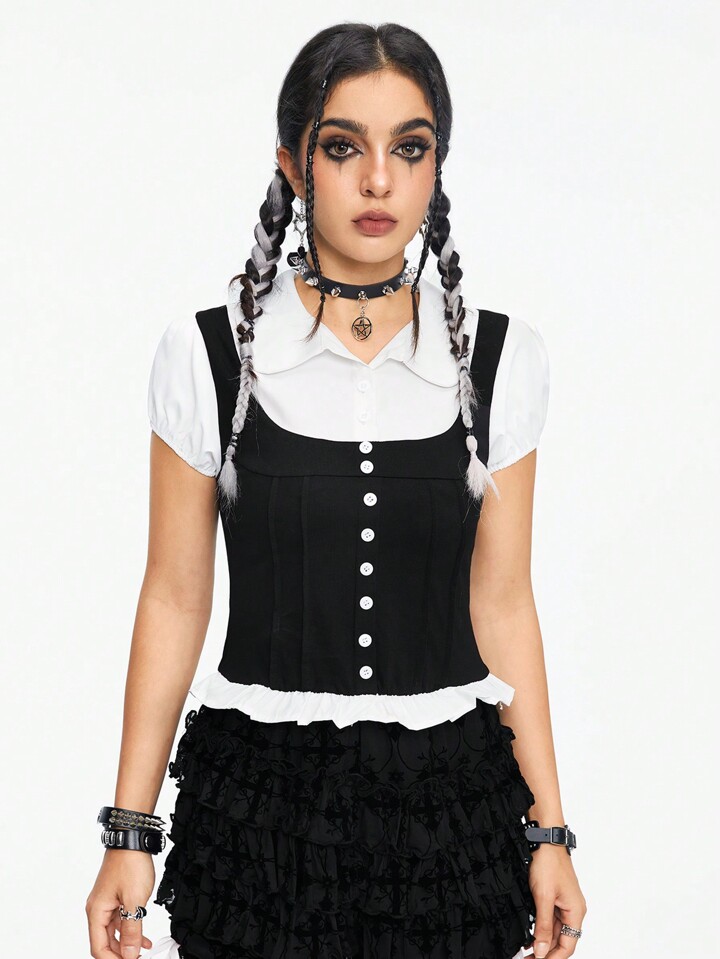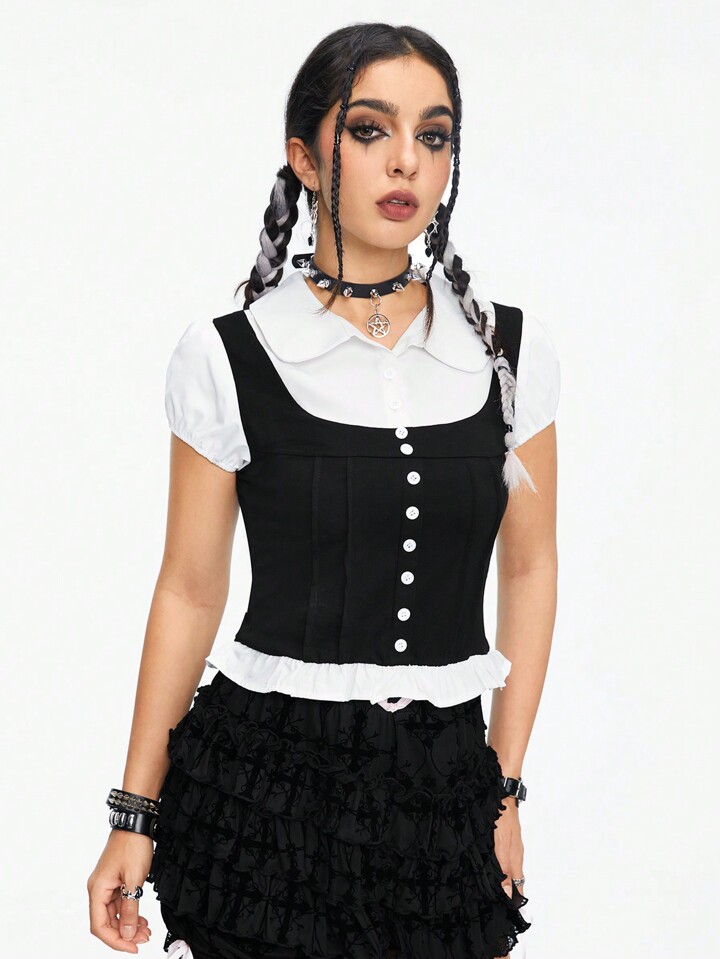 Goth Women's Summer Fashionable Black And White Spliced 2 In 1 Shirt