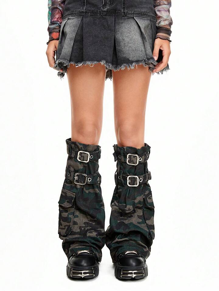 Goth Women's Unique Distressed Camo Print Leg Warmers, Y2K Punk Street Style Garter Leg Bands