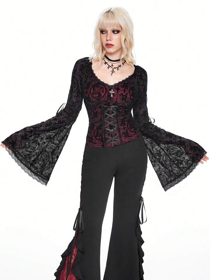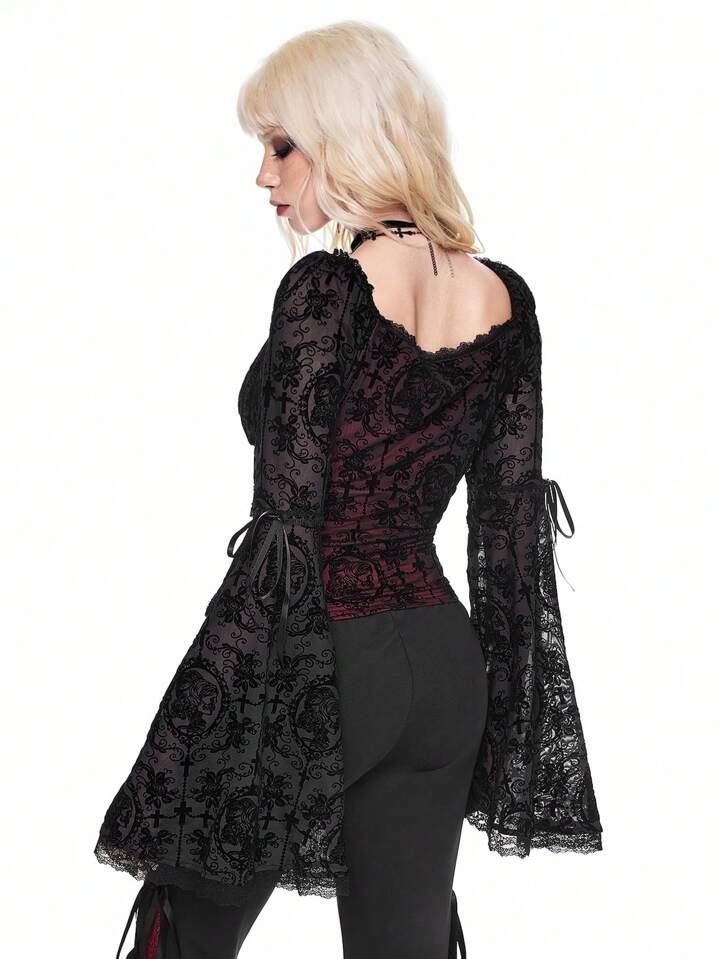 Goth Women's Vintage Daydreamer Flocked Flared Sleeve Ribbon Tie-Up Contrast Color T-Shirt