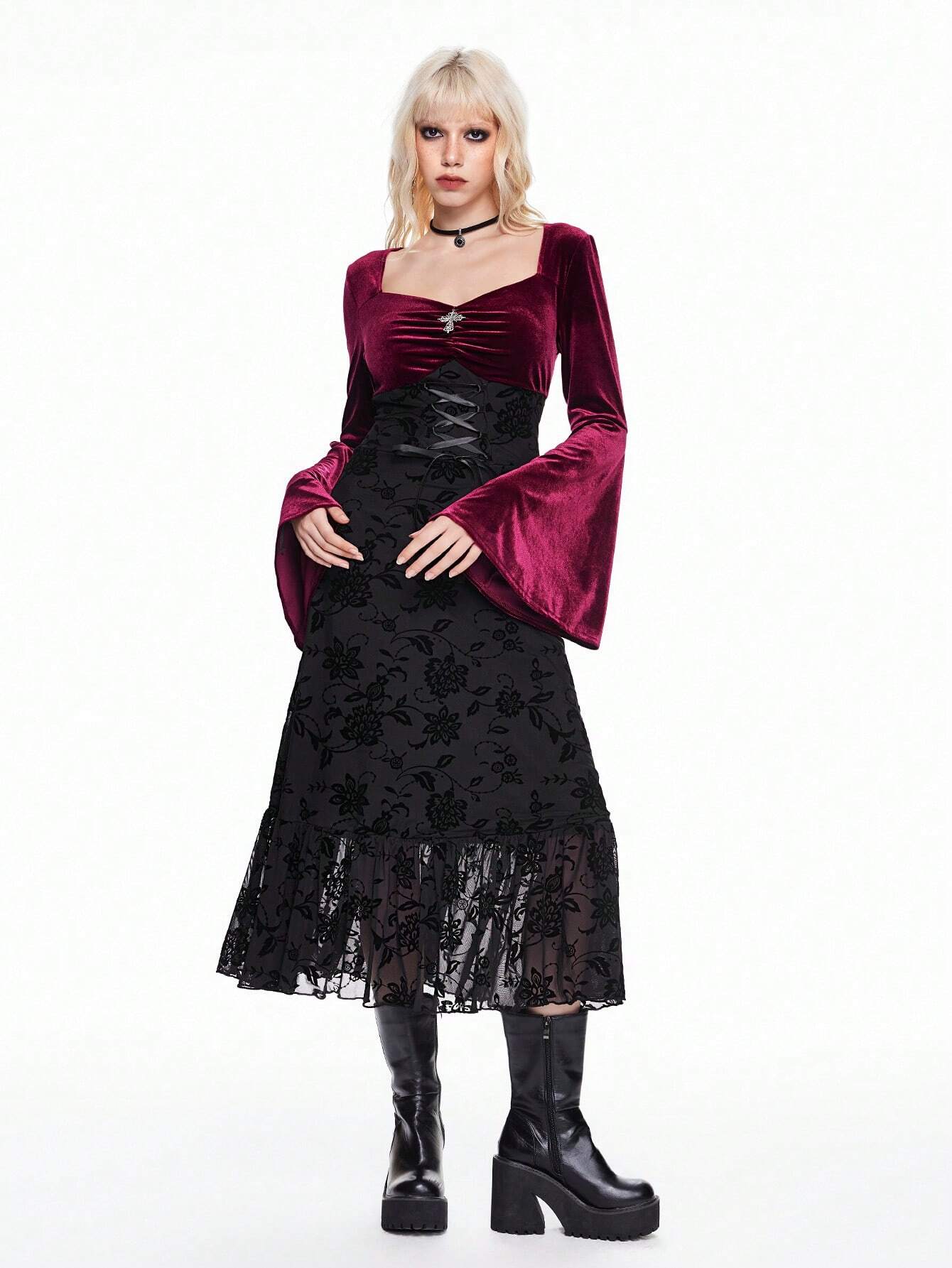 Goth Women's Witch Style Fairycore Square Neck Flocked Patchwork Flocked Flare Sleeve Dress