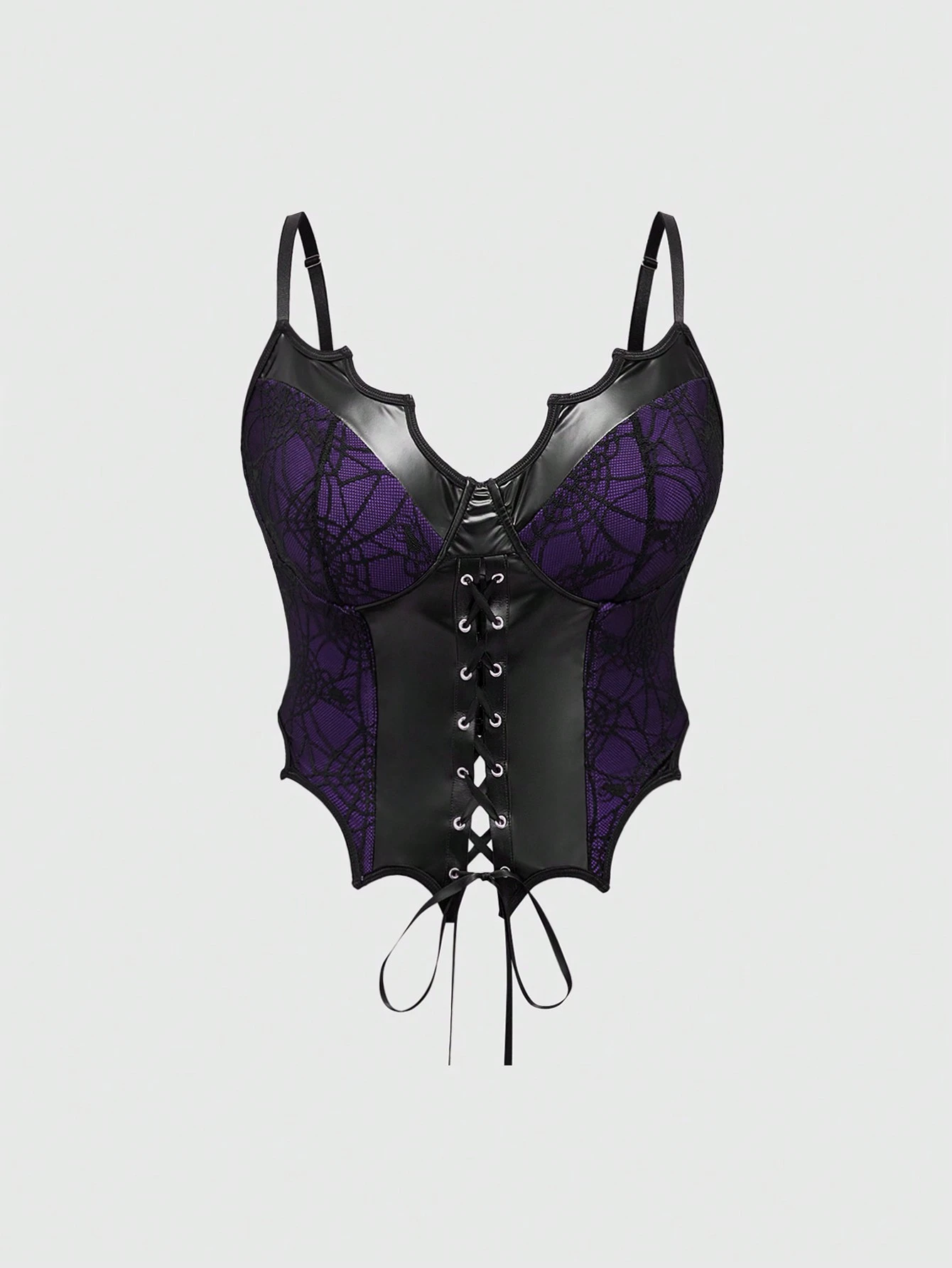 Goth Y2K Dark Sexy Spider Web Lace Patchwork Bat Shape Colorblock PU Leather Adjustable Camisole Crop Top For Women, Halloween