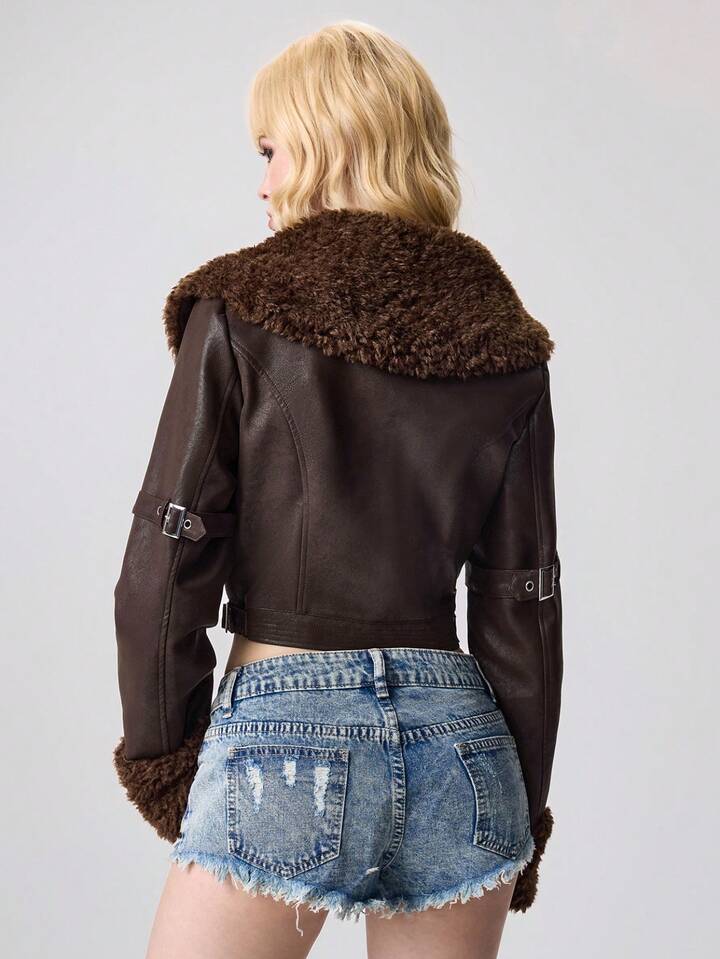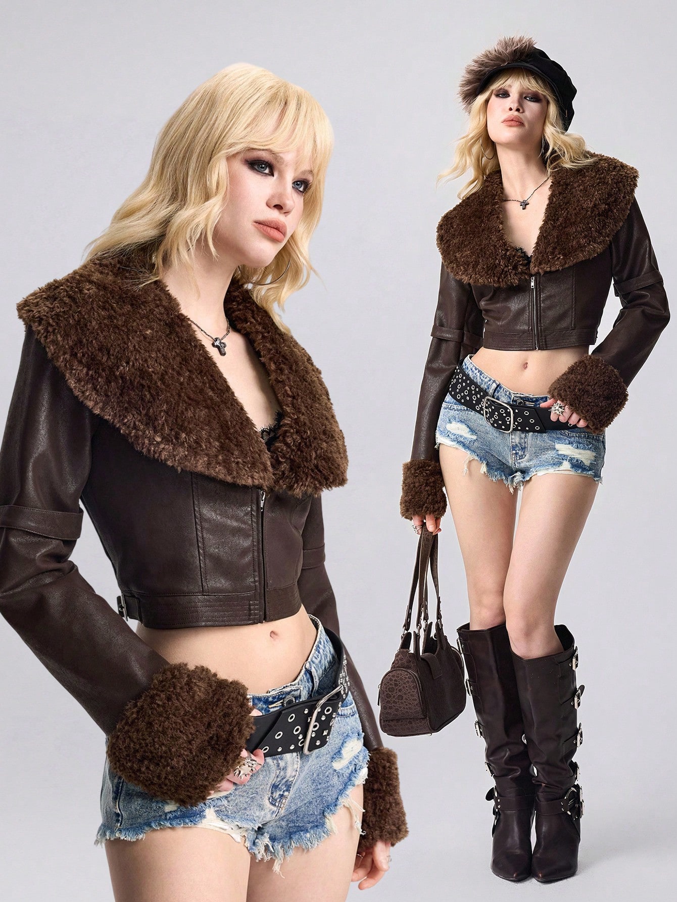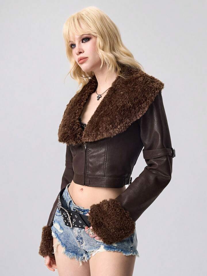 Goth Y2K Sexy Biker Jacket For Women, Faux Fur & Suede Patchwork Short Cropped Motorcycle Jacket