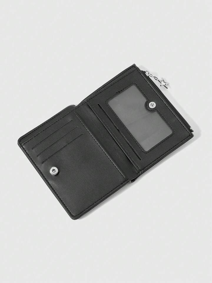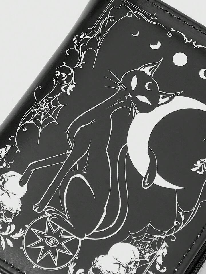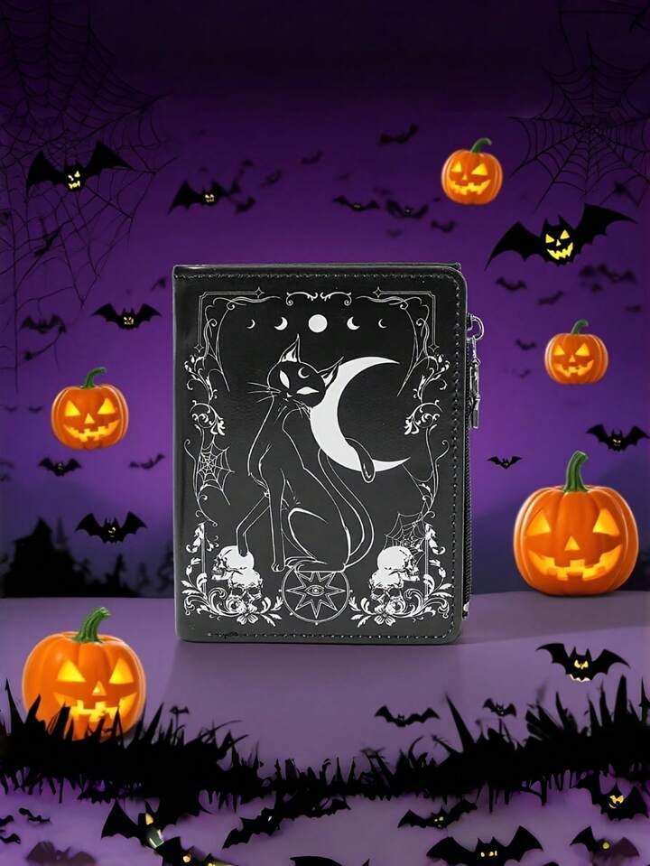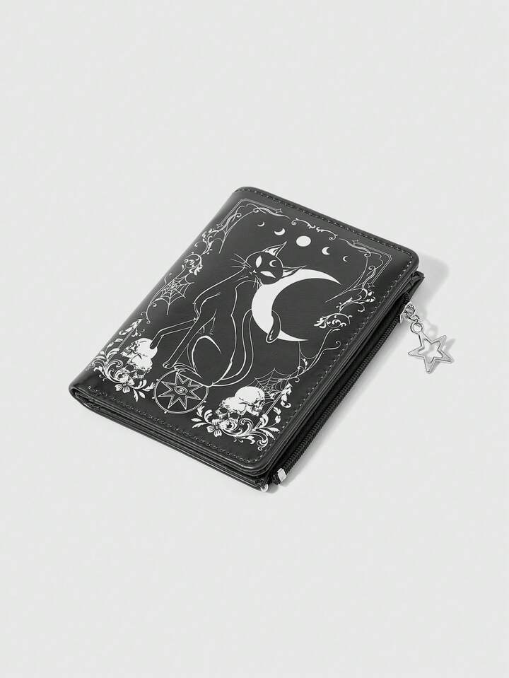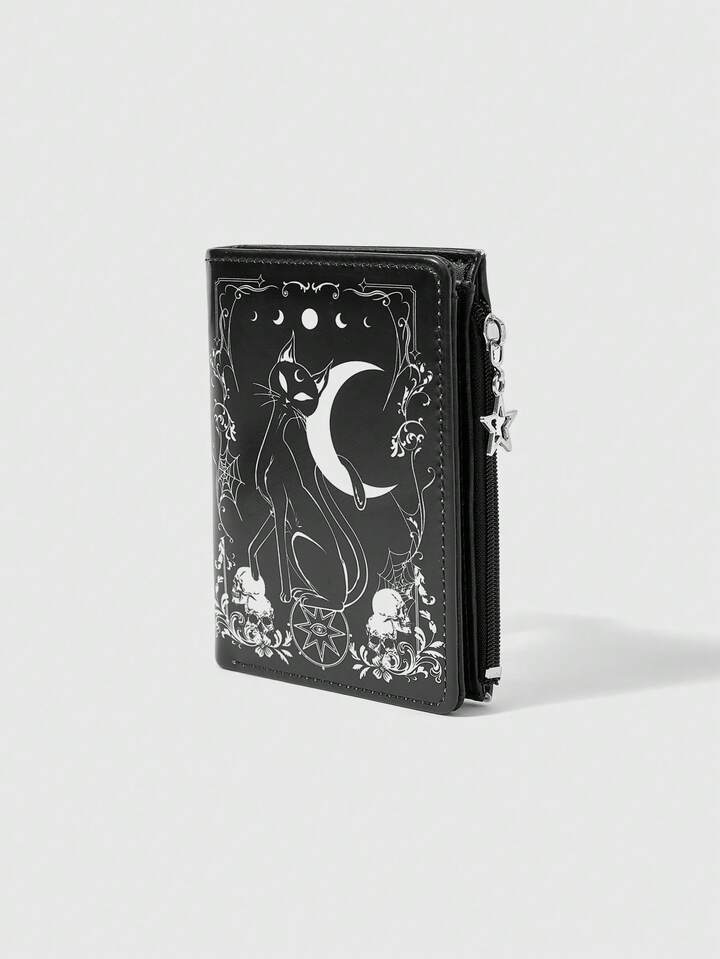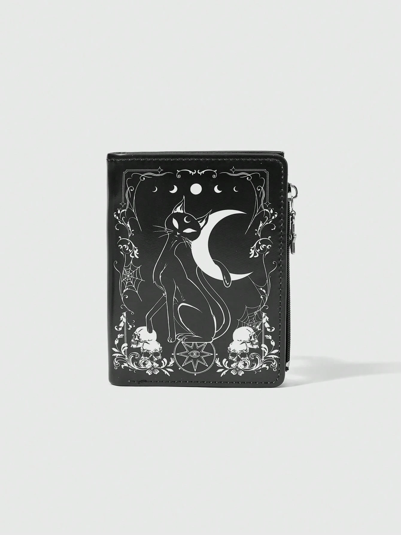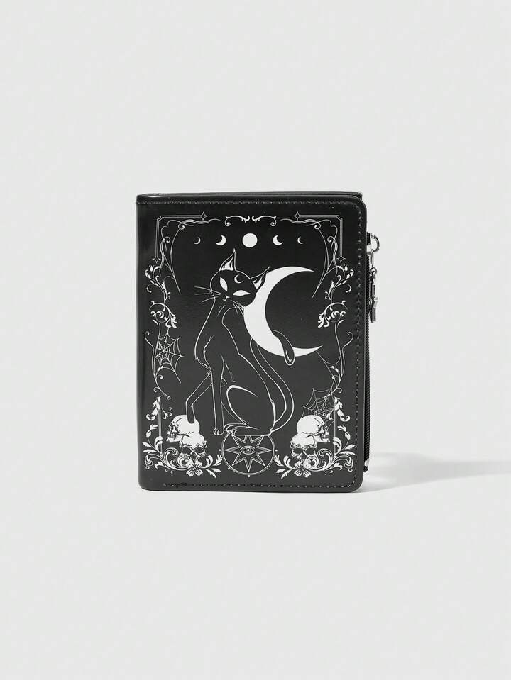 Gothic Crescent Moon & Black Cat Print Multi-Functional Multi-Card Slot Five-Pointed Star Zipper Short Wallet, Casual Fashion Card Holder, Coin Purse