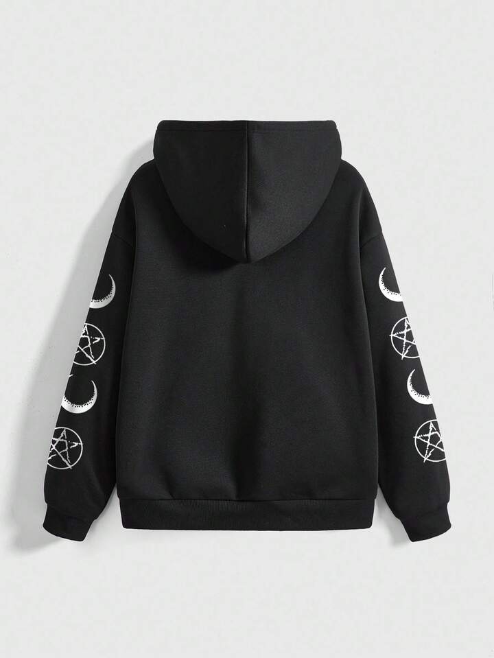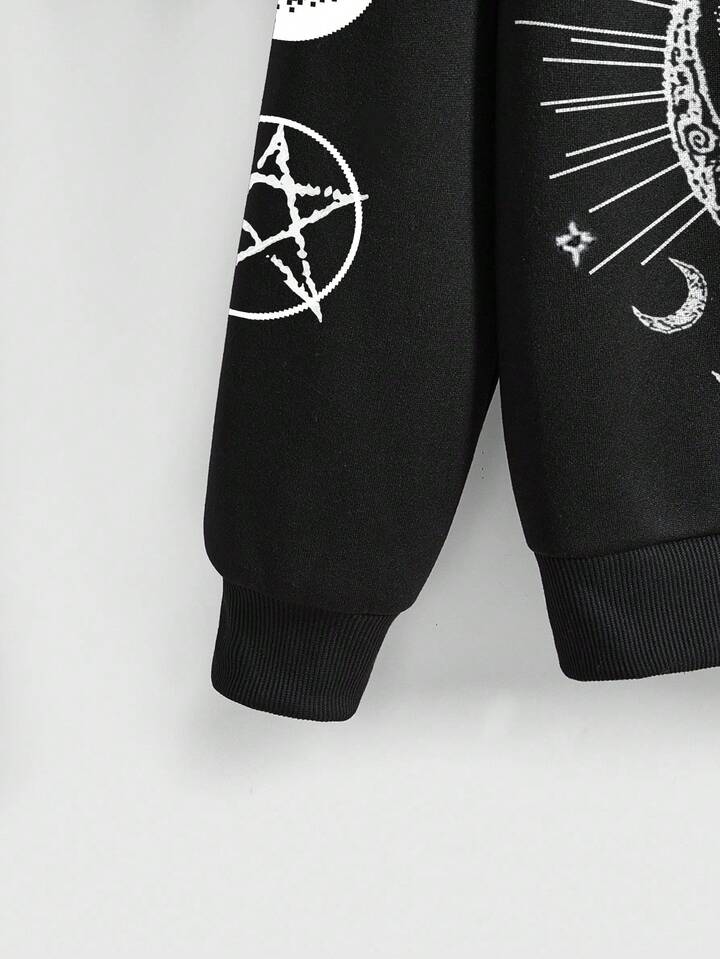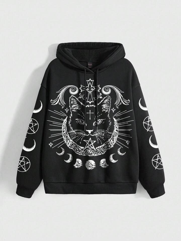Gothic Dark Cat Mysterious Cross Pentagram Devil Sun Moon Star Cat Loose Street Graphic Hoodie Sweatshirt For Women, Black